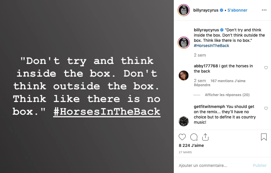 Le vrai problème, c’est que Lil Nas X est noir, et le monde du country, lui, n’est pas très ouvert aux différences du genre. Si Billboard se défend d’avoir tenu en compte quelconque connotation raciale, beaucoup pensent qu’il y a anguille sous roche. Premièrement, parce que Lil Nas X a pris le soin d’afficher Old Time Road comme une chanson country sur toutes les plateformes. Deuxièmement, parce qu’une légende du country comme Billy Ray Cyrus, le père de l’autre Cyrus, offre au rappeur de collaborer sur un remix de la chanson. Le paternel de Miley prône d’ailleurs l’ouverture d’esprit dans un post Instagram : “Don’t try and think inside the box. Don’t think outside the box. Think like there is no box. #HorsesInTheBack”