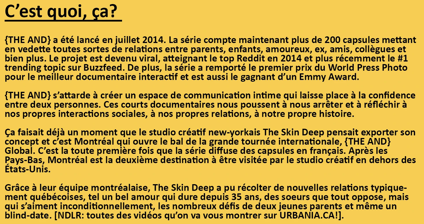 Collègue – Oui et imagine-toi donc que l’équipe derrière le projet débarque à Montréal pour tourner les toutes premières rencontres en Français.