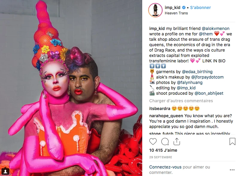 Un article en profondeur sur une drag queen de feu, publié sur le site them.us. Imp Queen et l’artiste qui mène l’interview, Alok, sont tous les deux à suivre, notamment sur Instagram et sur Facebook, où elles ont une présence vraiment engageante.