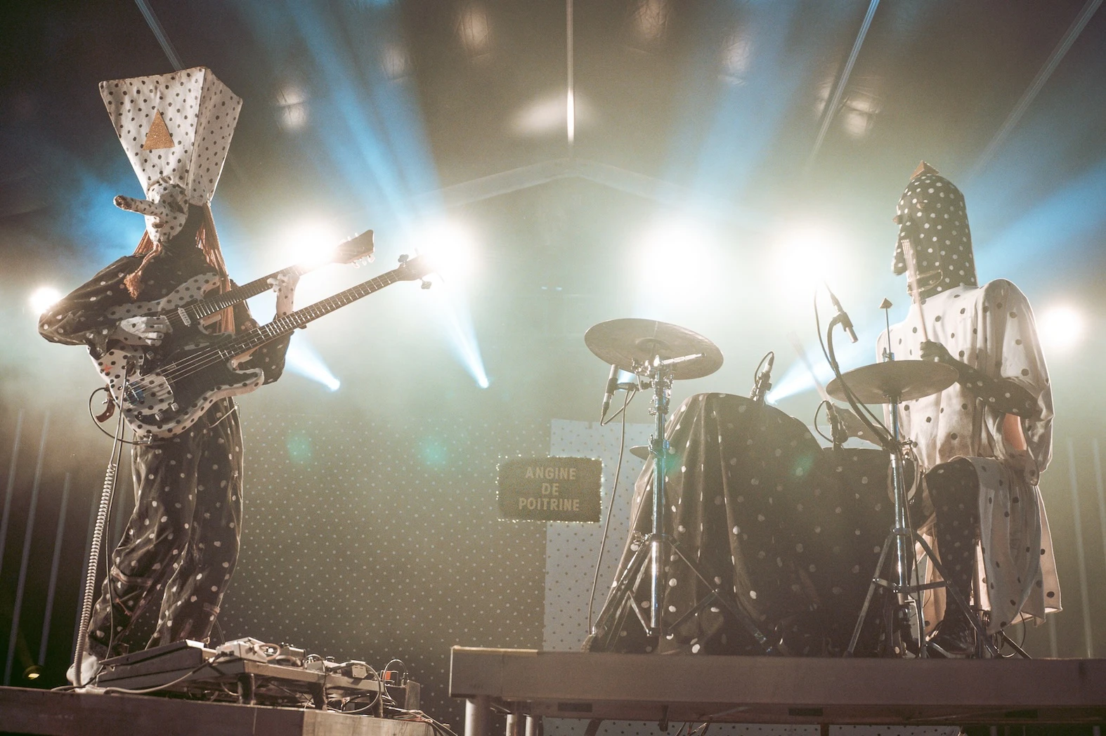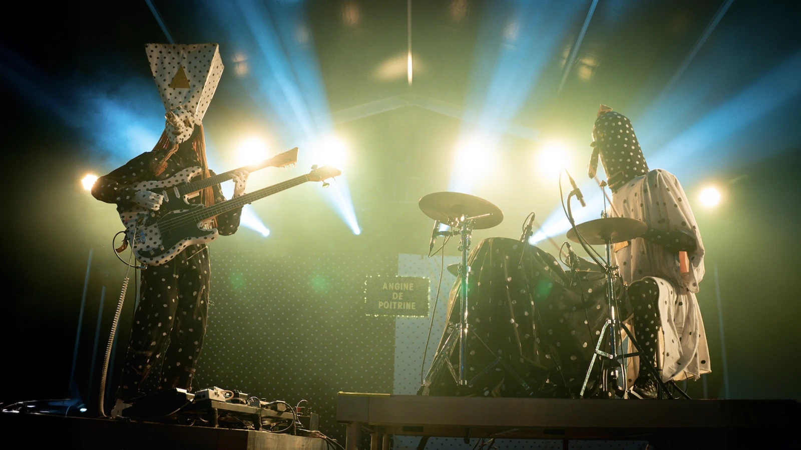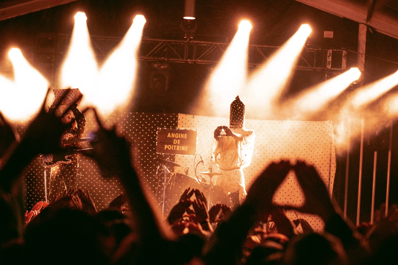 Leur drap picoté signature s’étire derrière eux, leur esthétique bichrome inversée claque sous les projecteurs. Angine de Poitrine arrive, mains levées en triangle. Un salut codé aussitôt renvoyé par les initiés des premiers rangs.