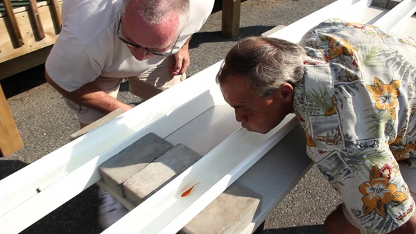 On a chacun notre petit poisson dans notre filet, on l’installe dans une dalle faite sur mesure avec des gouttières. On souffle tranquillement sur le poisson, mais lui il va à sa convenance. Ça peut être long comme ça peut être très rapide. Y’a des poissons qui ne se rendent jamais au bout.