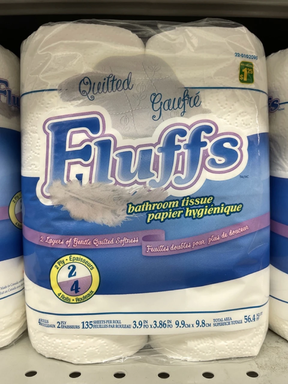 Je suis allé visiter un commerce qui, fut un temps, vendait tout à une piasse. J’ai opté pour l’option la moins chère dans toutes les formes de papier pour que ce soit juste. Un paquet de quatre rouleaux étant à 1,25 $, cela nous fait 0,3125 $ du rouleau et donc 0,0023148 $ du carré, comme il y en a 135.