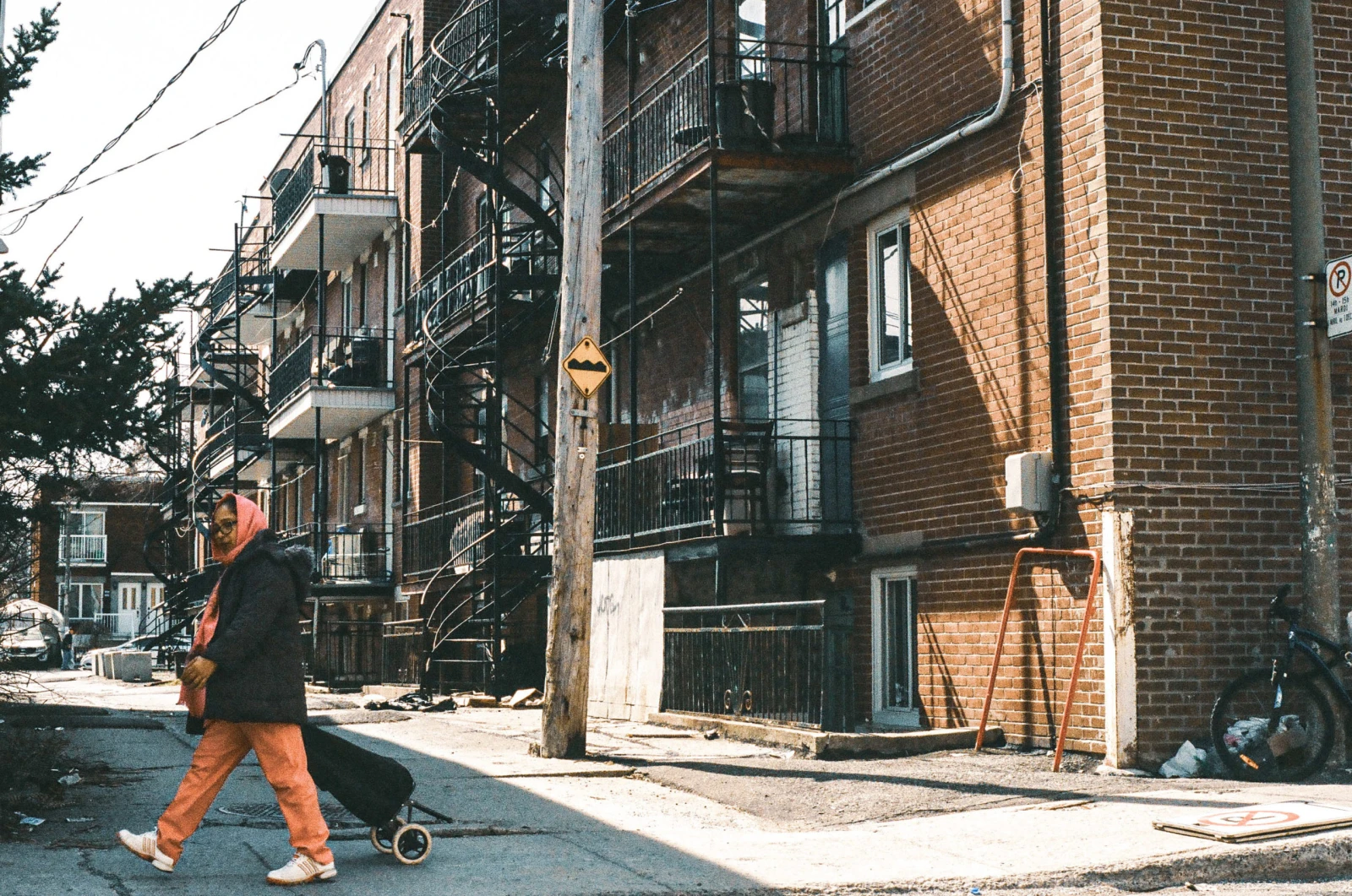 Osako, préposée du CLSC me laisse flatter son chien. « Le coin est vieux, tu sais. Une nouvelle génération s’y installera et amènera de la vitalité, le modernisera. Je vois d’un bon oeil les constructions. Il y a une épidémie de coquerelles et de punaises de lit, mais c’est la faute des propriétaires qui se sont déresponsabilisés. Ils ont laissé pourrir les infrastructures dans l’espoir de les rénover et faire grimper les prix », nuance la dame d’origine congolaise.