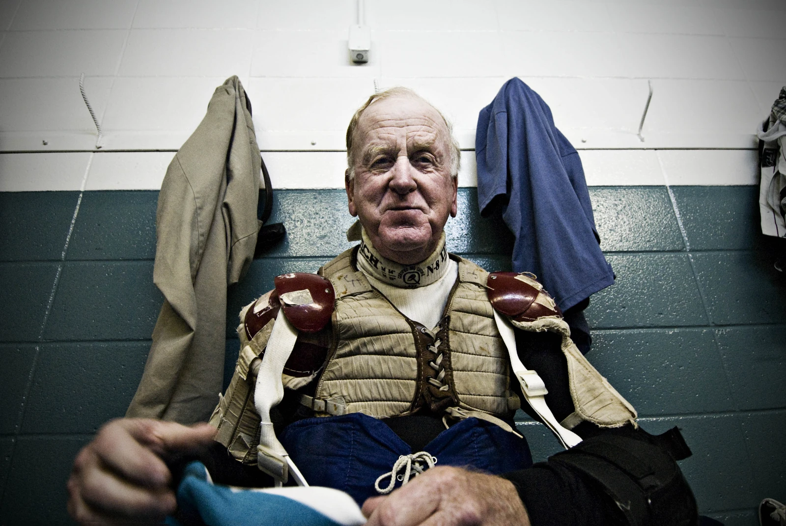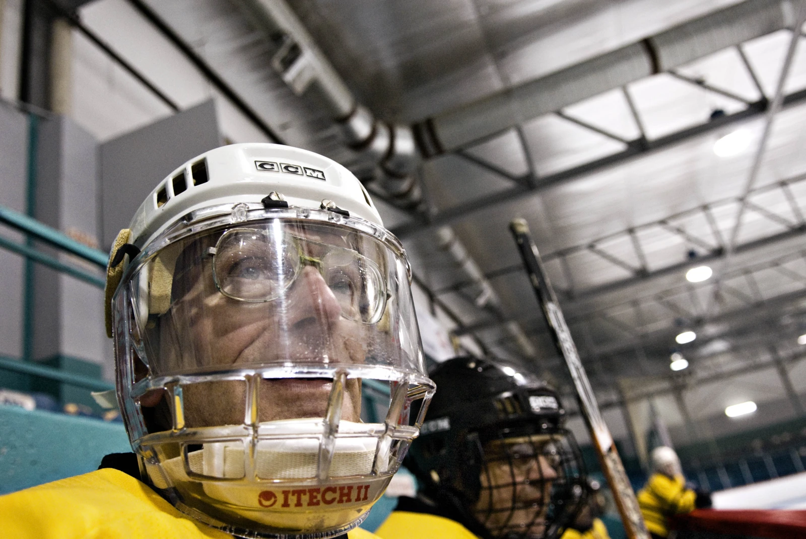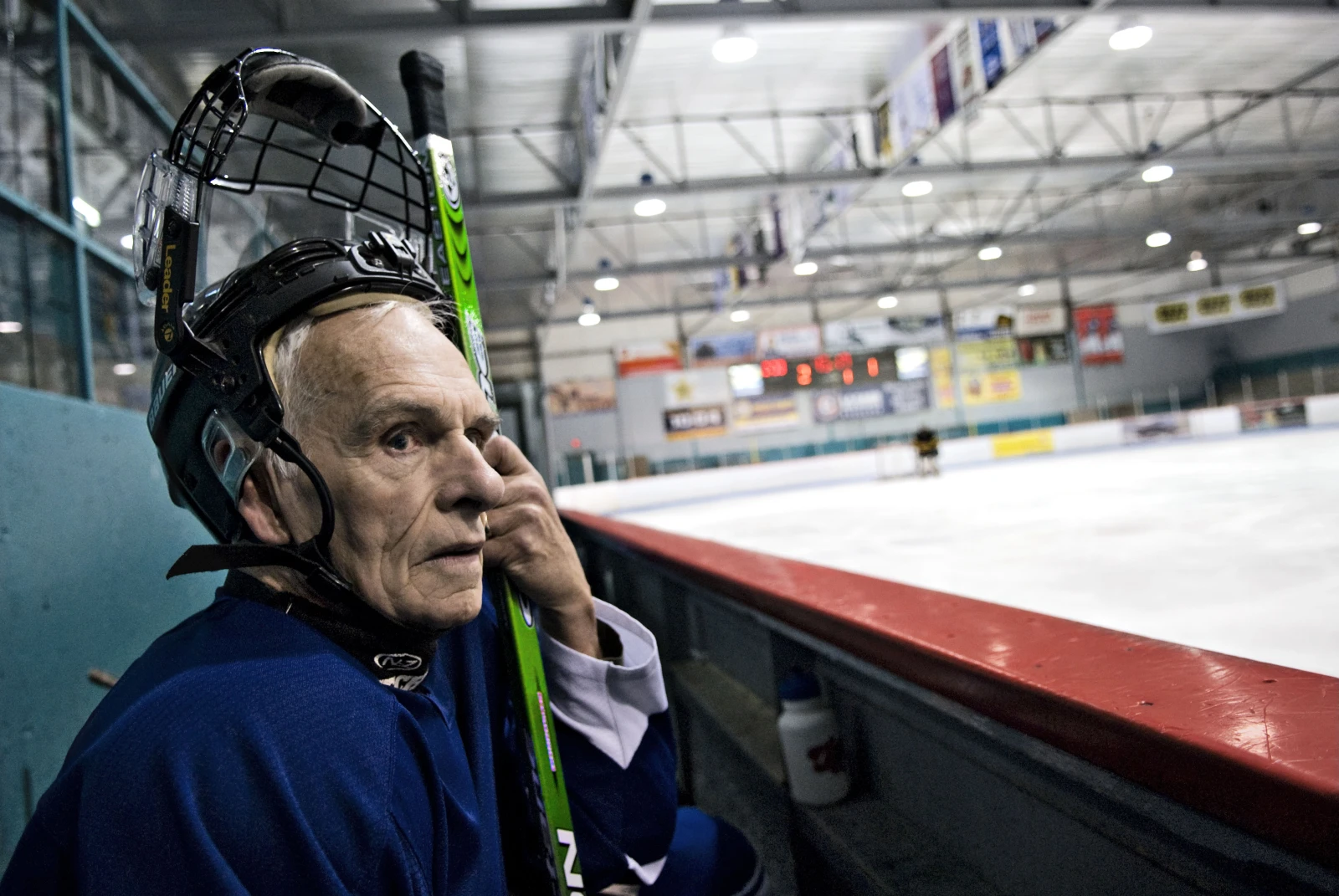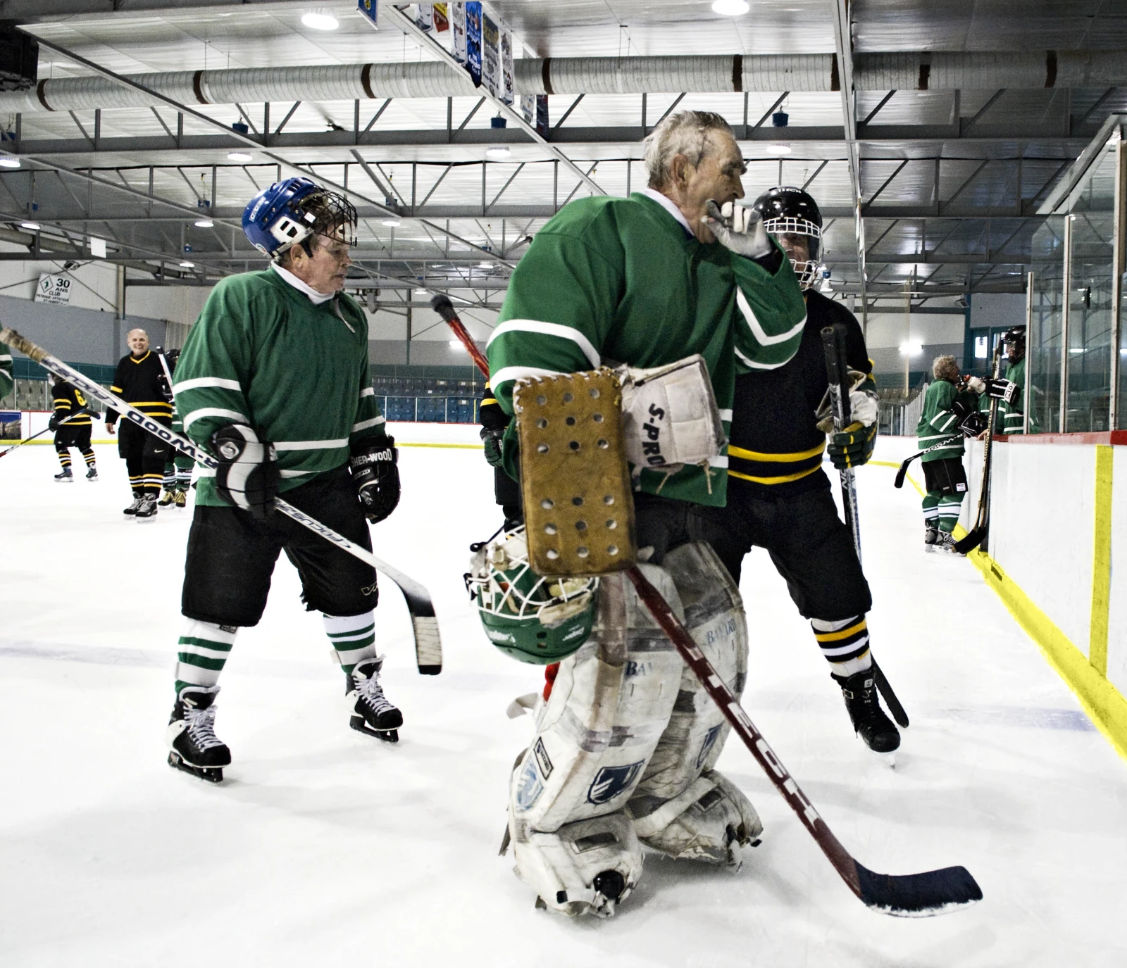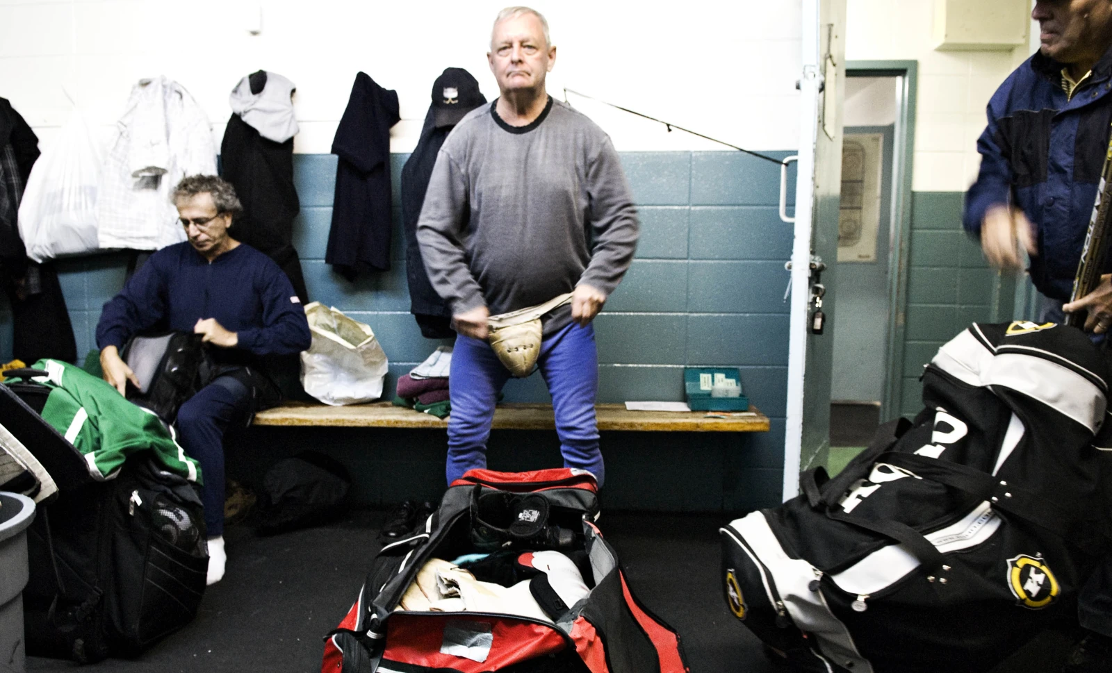 La ligue Géritol, c’est près de 150 hockeyeurs qui se réunissent à l’aréna Gaétan-Boucher de St-Hubert, deux fois par semaine. Parmi eux, on compte des médecins, des juges, des comptables, des ouvriers de la brasserie Labatt, des forgerons, des camionneurs… tous à la retraite. La moyenne d’âge des membres des huit équipes est 65 ans, mais Gaston, le doyen, en a 80. Ces fringants joueurs nous ont ouvert la porte de leur vestiaire, là où ils s’échangent des blagues salées tout en se graissant généreusement les muscles de Tiger Balm.