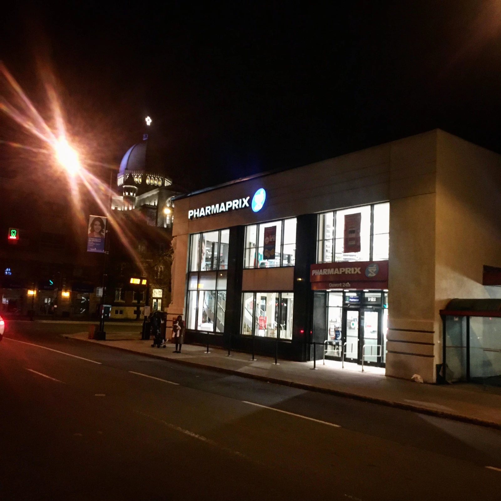 Quelques passants attendent leur autobus, d’autres font leurs courses un peu plus loin au marché de nuit sur Jean-Brillant. Pendant que la planète tourne au ralenti, ça fait drôle de voir un semblant de vie nocturne concentrée autour d’une pharmacie.