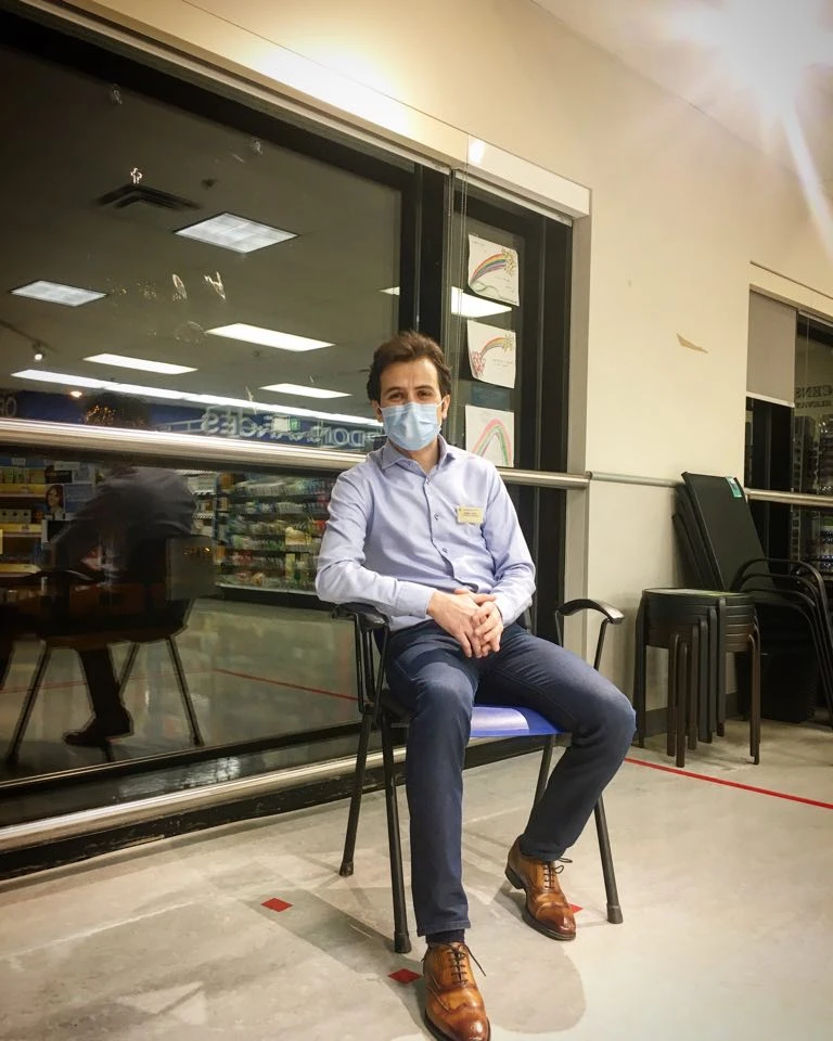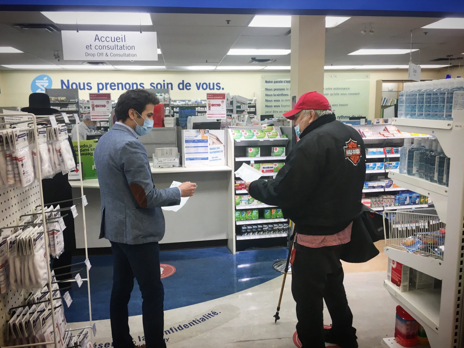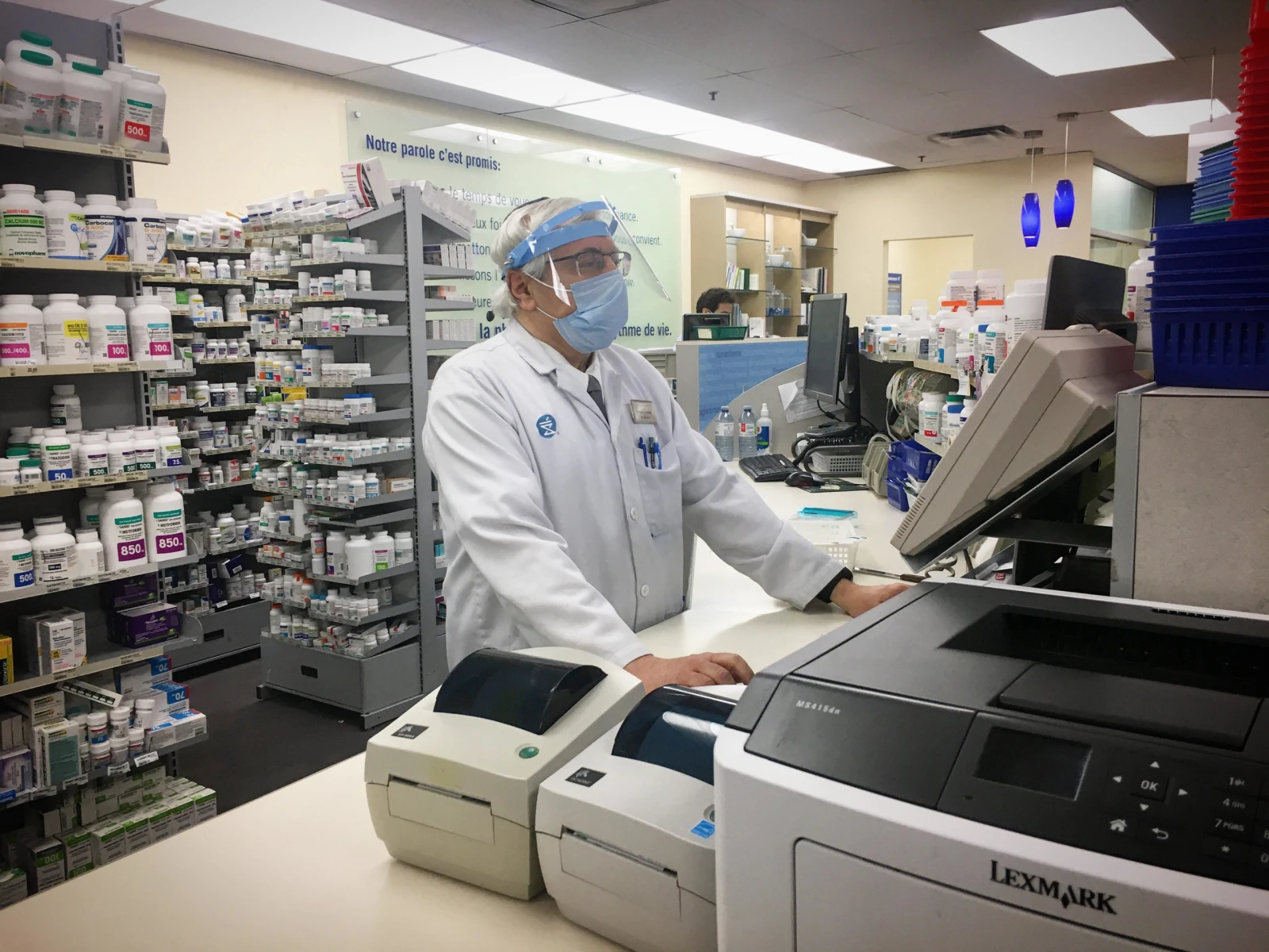Le pharmacien-propriétaire Nabil Chikh m’accueille à l’étage, en me tendant un masque. C’est au fond de l’étage que se trouve son comptoir, sans doute le plus achalandé de la province à l’heure actuelle. « Des gens viennent souvent pour briser la solitude. C’est probablement le seul moment en ville où il n’y a pas de polices de la distanciation sociale », explique Nabil, debout dans un emplacement désigné par du ruban rouge au sol servant à circonscrire les clients jugés « à risque modéré ».