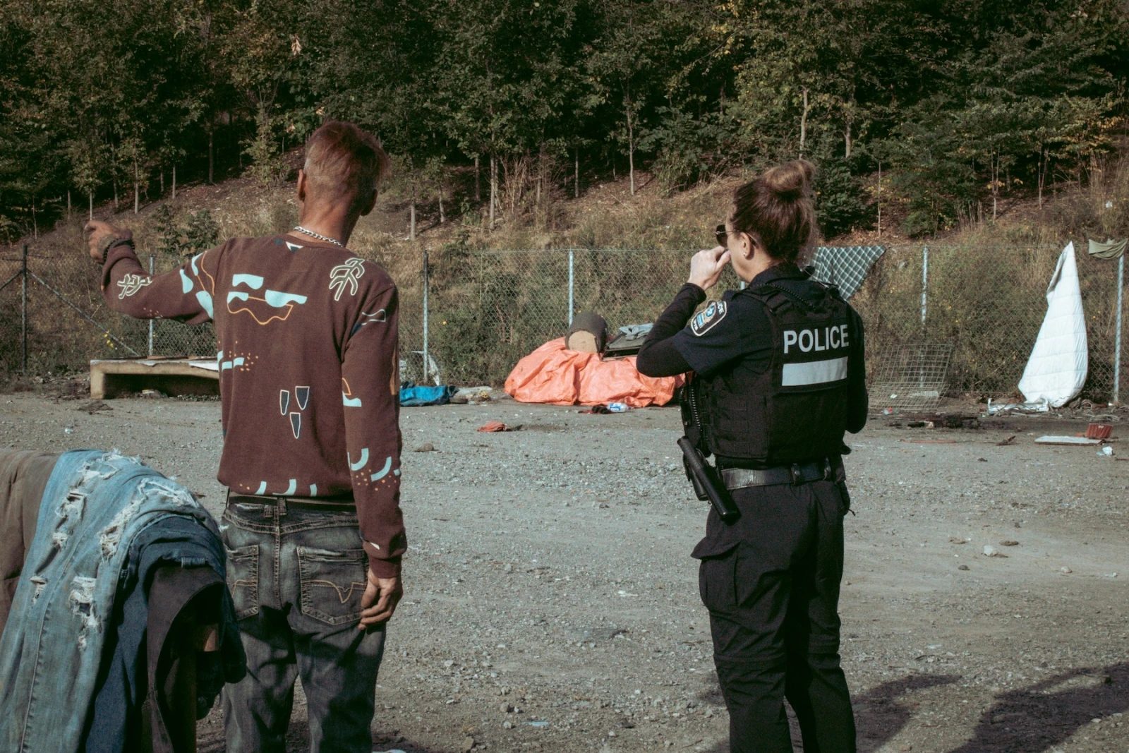 Accompagnés par des policiers, qui connaissent les occupants par leurs prénoms, les travailleurs ramassent les déchets accumulés sur le terrain.