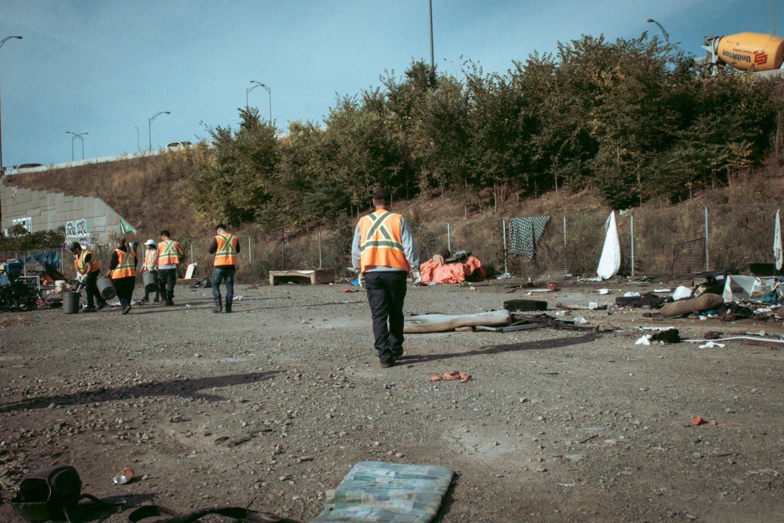 « Les gens pensent qu’on s’en vient démobiliser, défaire le campement. C’est vraiment pas ça. On fait juste améliorer la situation en faisant le ménage », explique Simon Guérin, contremaître pour la Ville de Montréal, qui supervise l’opération de nettoyage. « Ils ont un espace dédié, que ce soit un abri ou une tente – tout ce qu’ils réussissent à mettre dans cet enclos-là, on leur laisse, si c’est pas dangereux. »