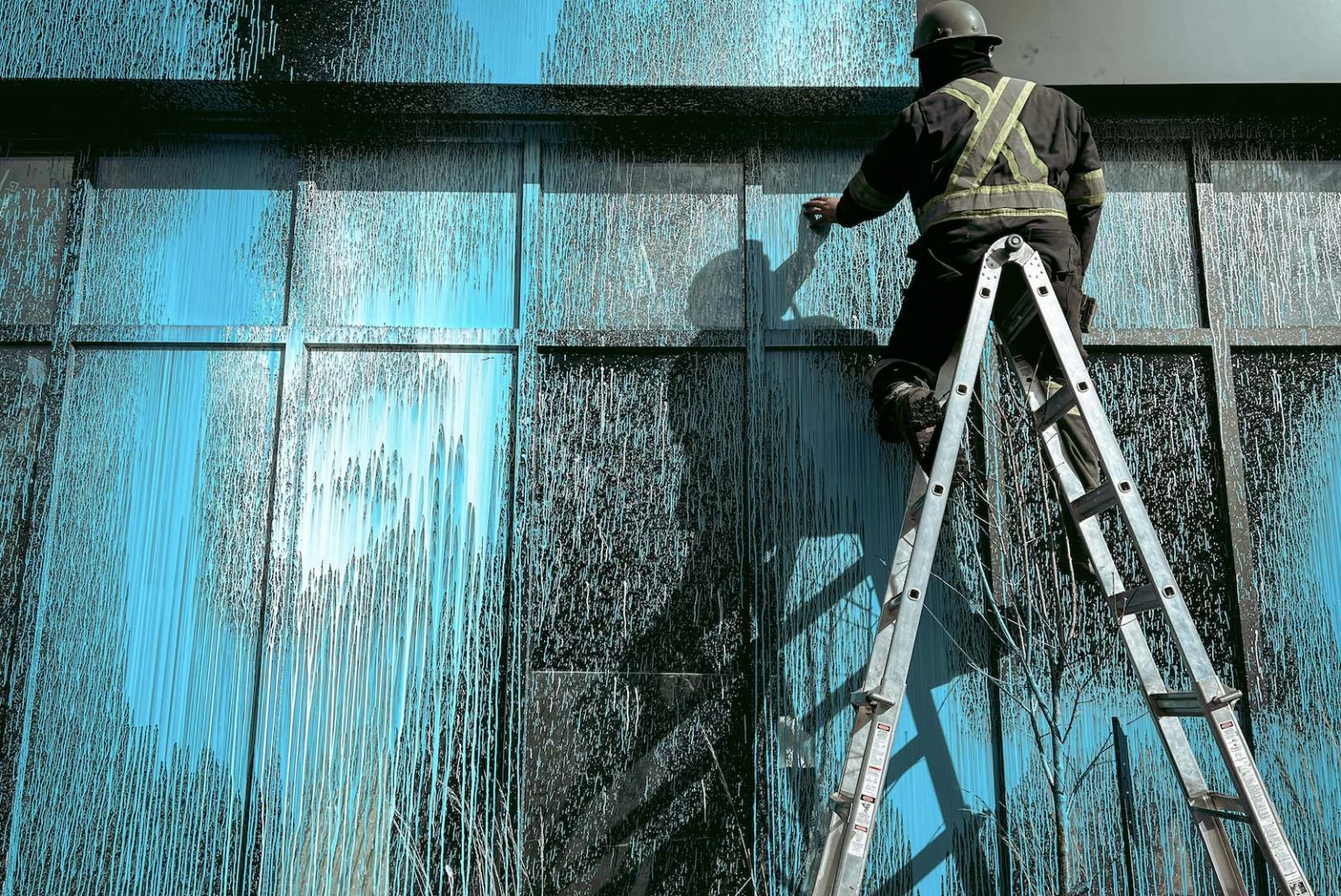 Perché en haut d’un escabeau, un employé en chienne de travail hésite à entamer sa tâche, ne sachant pas trop par où commencer : « Au moins, c’est de la peinture à l’eau! », s’exclame-t-il avec candeur.