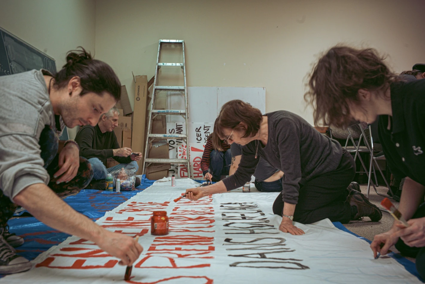 Une femme aux cheveux gris entre pour donner deux rideaux qu’elle vient de coudre et qui serviront à concevoir la banderole pour la manifestation. « C’est ça, le communautaire : on n’a pas une cenne. »
