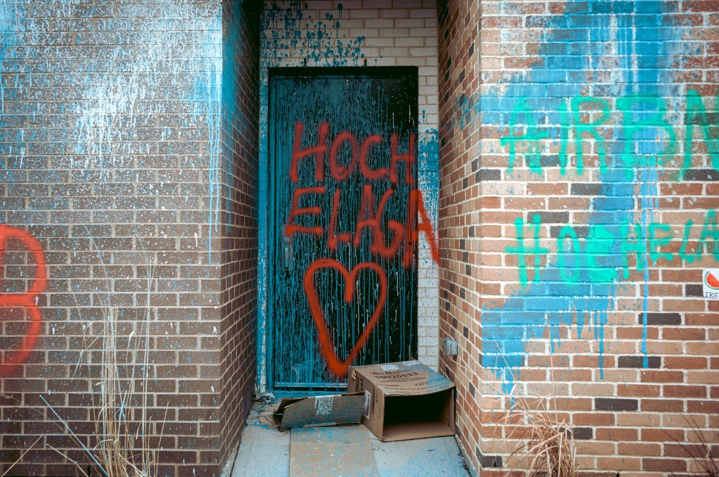 Les vandales sont revenus. Les parois peintes sont désormais tapissées par des affiches, déclarant l’adresse œuvre d’art collaborative et l’illustrant en proie aux flammes.