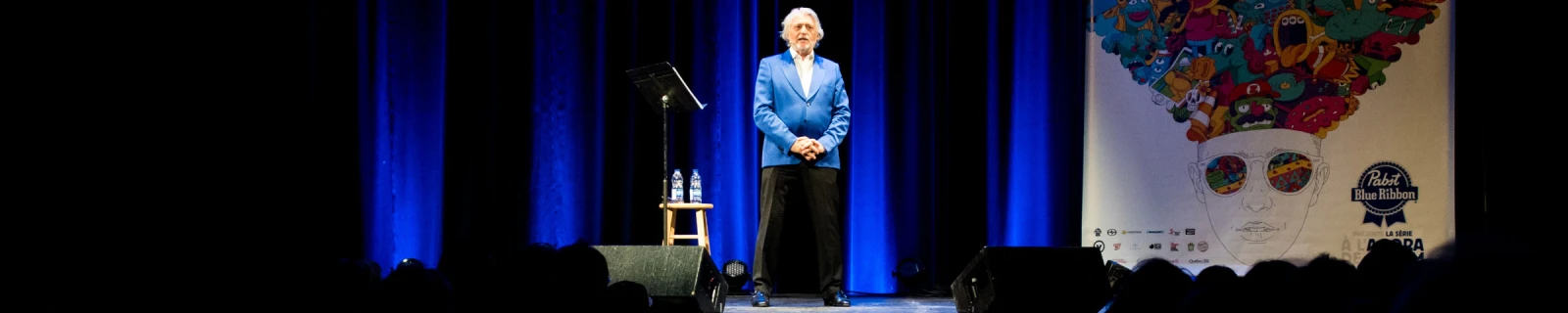 Le public était à peu près trois fois plus âgé que la moyenne habituelle du Zoofest, mais le DJ avait prévu le coup, enchaînant des tubes de Robert Charlebois et des Beatles avant l’arrivée sur scène du grand manitou de l’humour. Des banquiers, des vedettes du petit écran, des journalistes et beaucoup de baby-boomers remplissaient (pas tout à fait) l’Agora Hydro-Québec, splendide salle campée au cœur du complexe des sciences de l’UQAM. Gilbert Rozon allait enfin livrer le spectacle qu’il s’était engagé à donner, engagement pris sur un coup de tête qui semble refléter assez bien le parcours professionnel du fondateur de Juste pour rire.
