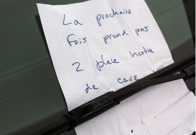 Note: La photo illustrant cet article a été prise sur ma rue. Ce n’est pas moi qui ai écrit cette savoureuse note (j’aurais mis un «s» à «place» évidemment), mais je connais l’«hostie de cave» qui prend toujours deux places: c’est mon voisin d’en face. Lui, contrairement au gars de Laval, n’a vraiment pas d’excuse.