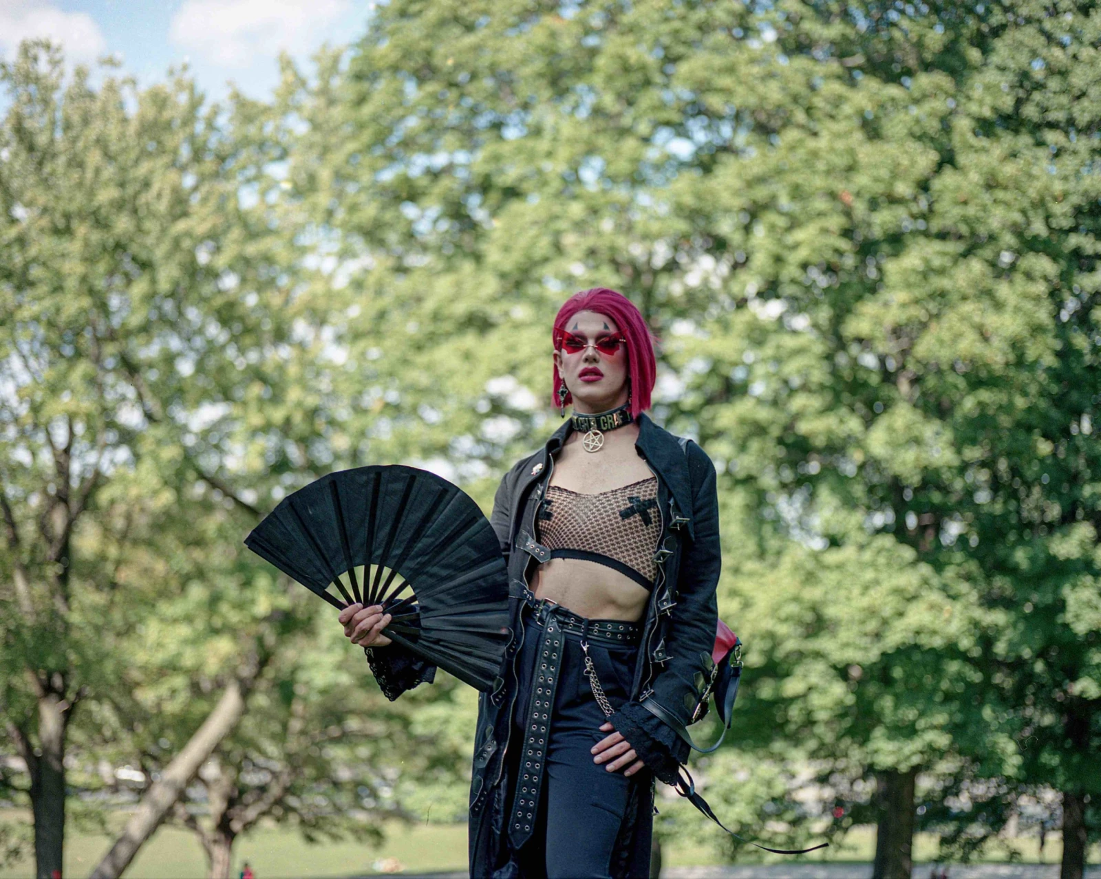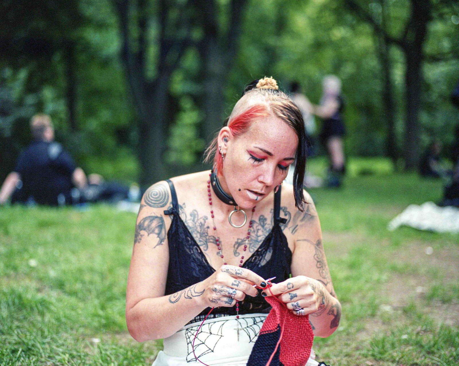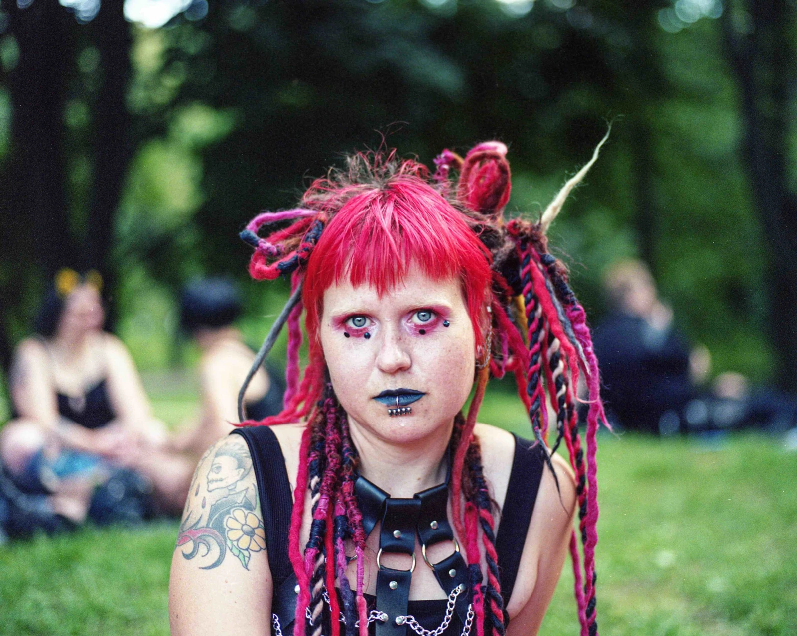L’ambiance qui règne est festive, plus proche du cosplay que du cliché torturé. On partage les miroirs pour des retouches d’après french, se complimente sur les créations, enfile les stories. Devant moi, un furet fait la connaissance d’un chien. Se faufilant entre les sacs à dos en forme de cercueil, les anges tatoués et les dreads de couleur, un participant distribue des cupcakes Forêt-Noire aux invités allongés au sol. Certains semblent plus seuls, dessinent, regardent leurs cellulaires sous un arbre, mais la majorité est en groupe et partage des chips, roule des joints. Ils arrivent d’Hochelaga, d’autres de l’Estrie. Il y a de la danse et les rires contagieux sont agrémentés par l’écho de bruits de fouet.