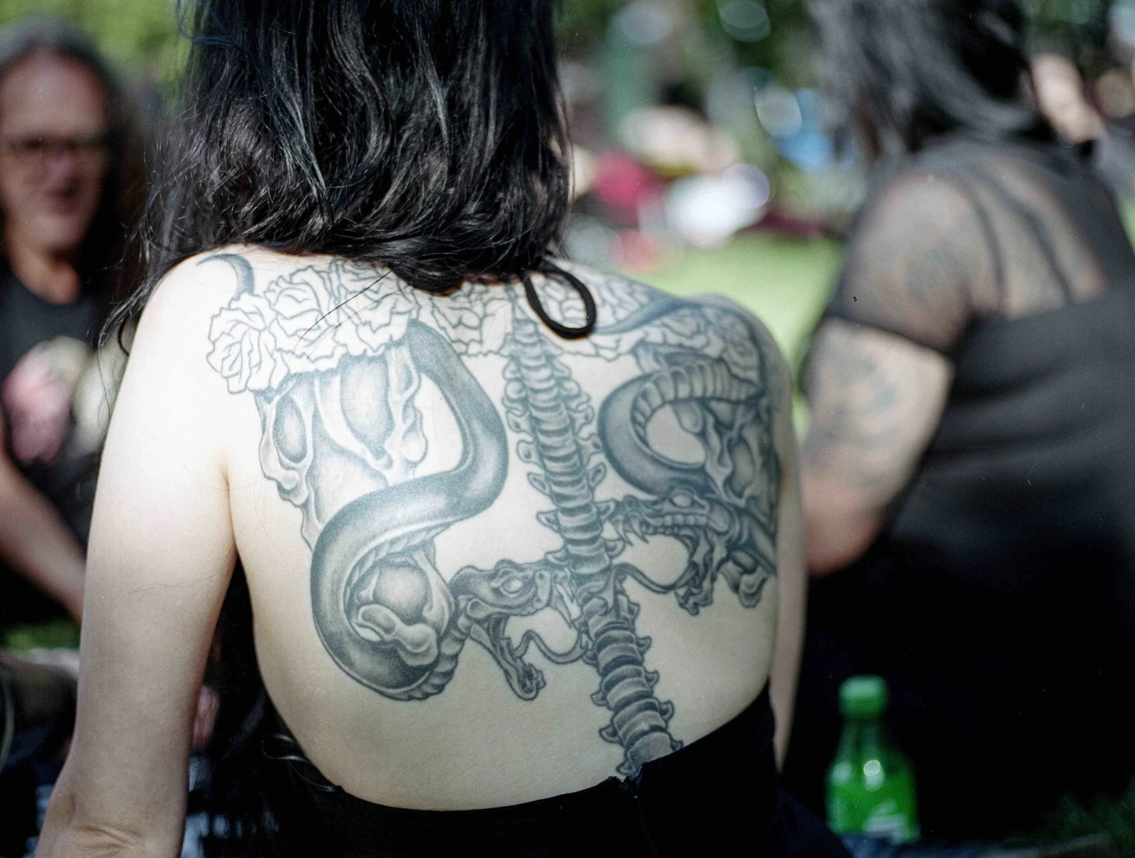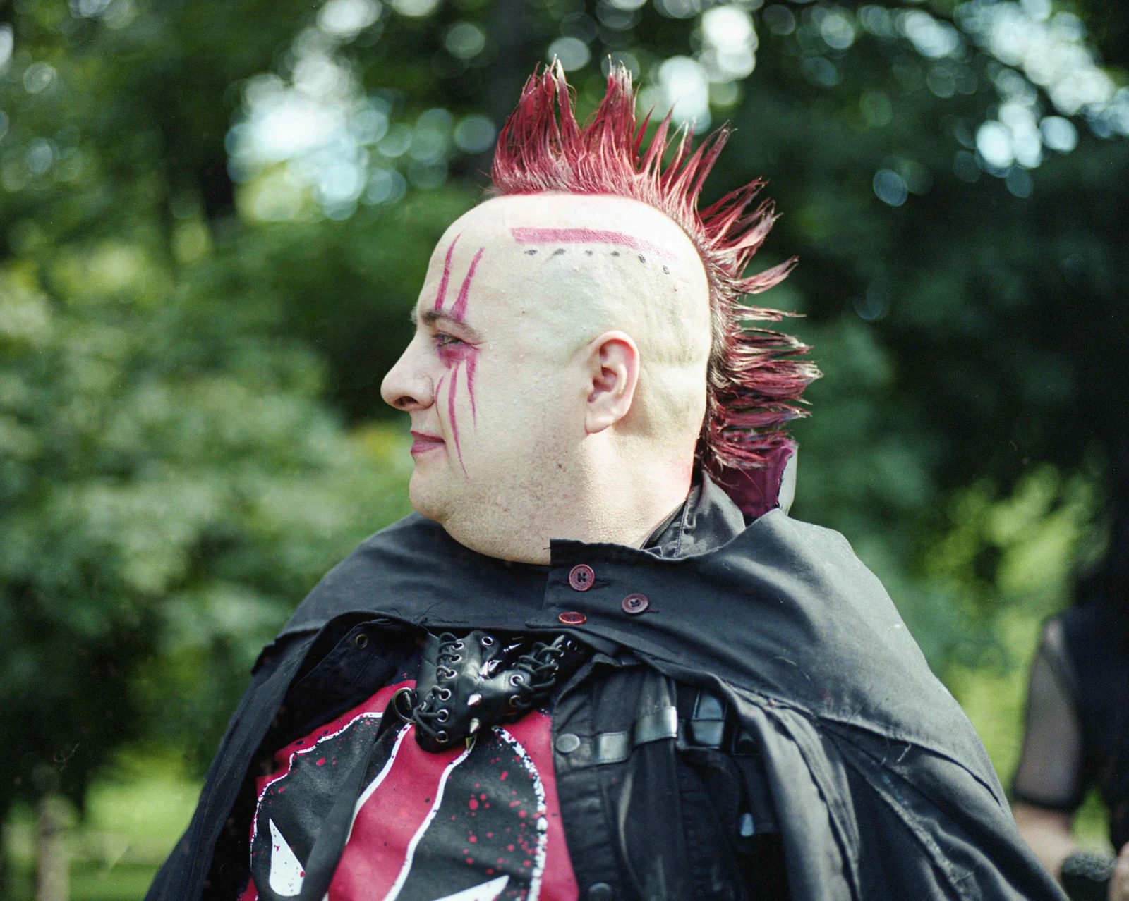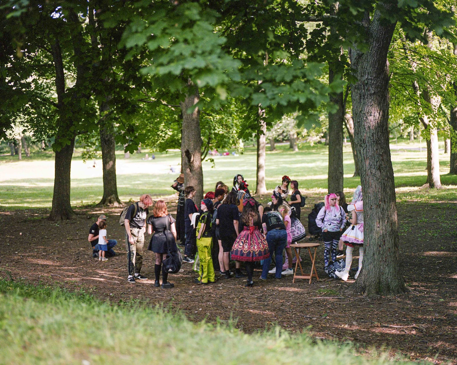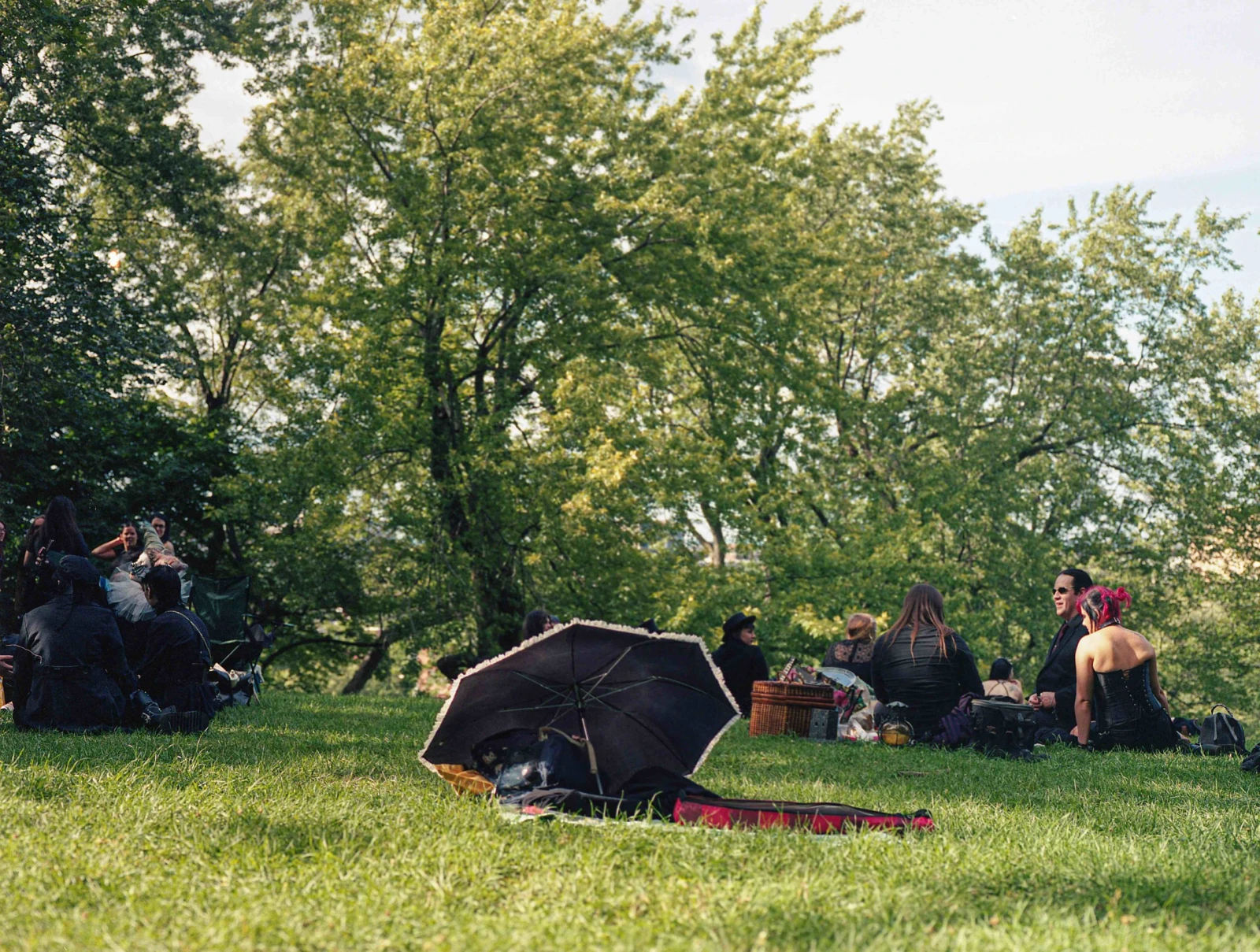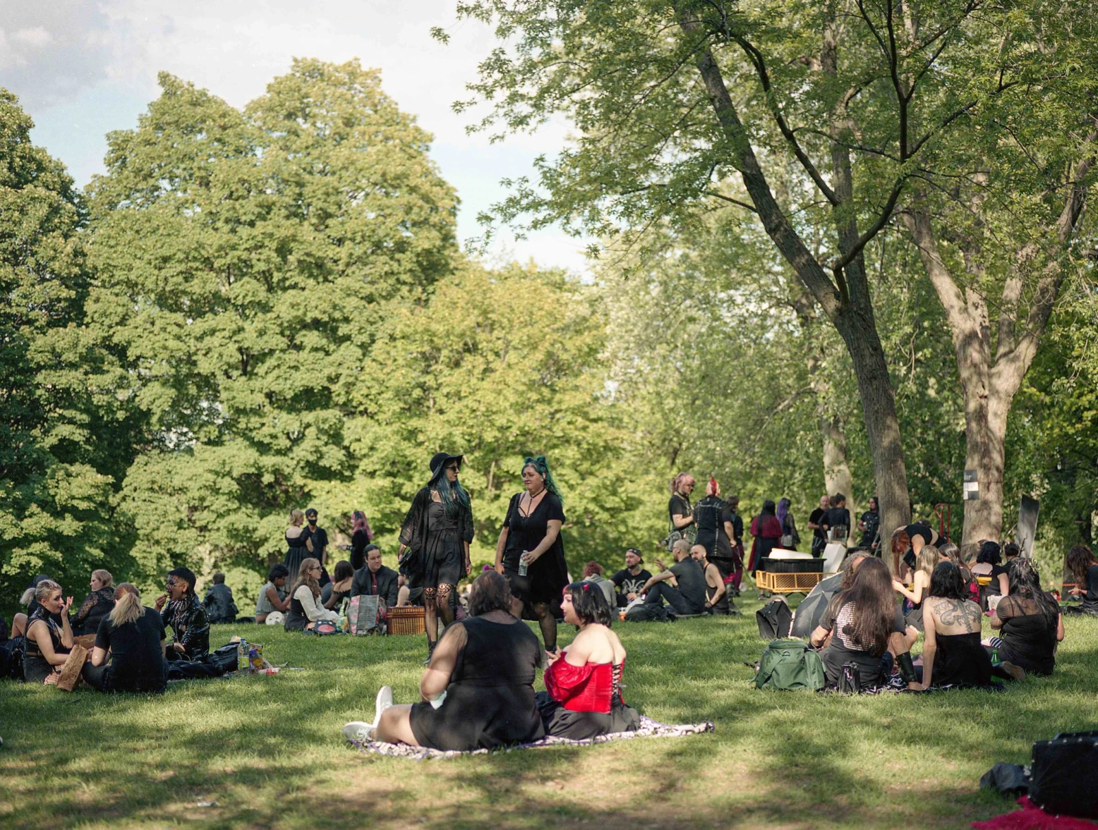 Les collines de la montagne offrent depuis toujours un refuge aux sous-cultures les plus diverses. Dans un décor aussi bucolique, les rencontres sont faciles. On jase cinéma d’horreur, musique coldwave, corpse painting dans le black métal. Une mosaïque noire d’une éclatante diversité défile sous nos yeux. Des amis et des familles de toutes les générations : bébé goth, enfants aux cheveux teints, ados rebelles, vétérans du milieu. Quelques joggeurs curieux bifurquent de leurs trajets pour venir jeter un coup d’œil au rassemblement comptant quelques centaines de participants. Avec sa situation dans une clairière où s’immiscent des filets de lumière sous un toit de verdure et un ciel clément, la scène prend des airs d’une toile de Georges Seurat.