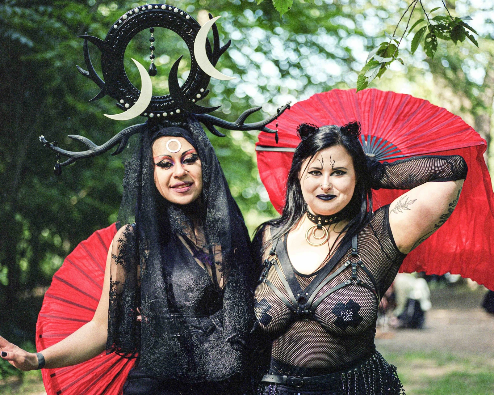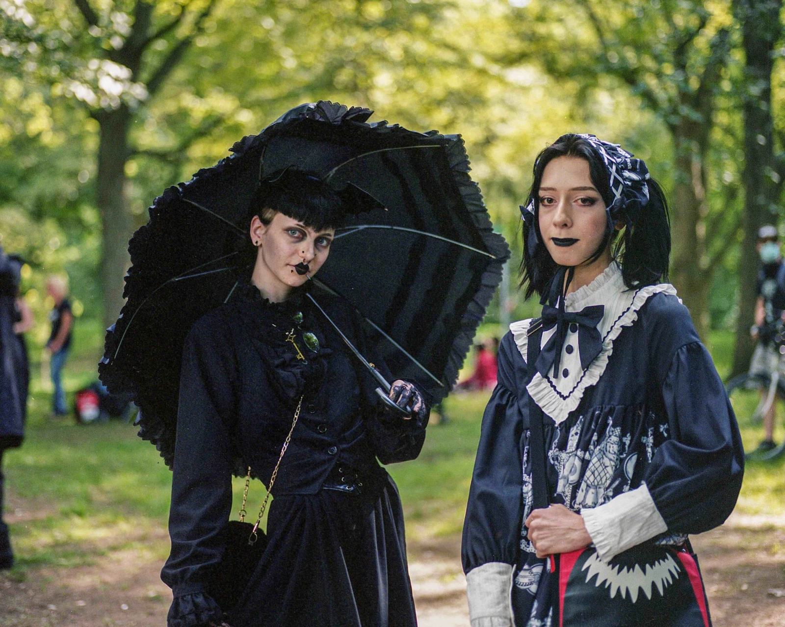 Je descends l’avenue du Parc derrière deux dames plus âgées lorsque nous croisons un groupe de jeunes filles au look gothique, puis des hommes à l’allure tout aussi lugubre sortent de la ruelle traînant une glacière avec nonchalance. Plus loin, d’autres traversant l’intersection en hurlant comme des loups. Visiblement désarmées devant l’inusité de la scène, elles se retournent et me demandent pince-sans-rire à quel festival elles n’ont pas été invitées? Un recoin excentré du mont Royal accueillait justement samedi dernier la huitième édition du Grand Pique-Nique Gothique de Montréal. Fête tenue sous le signe du romantisme noir, étalée sur toute la journée, j’y ai tiré quelques portraits avec ma vieille caméra japonaise et profité du moment pour rencontrer ces gens aux accoutrements jugés si inquiétants.