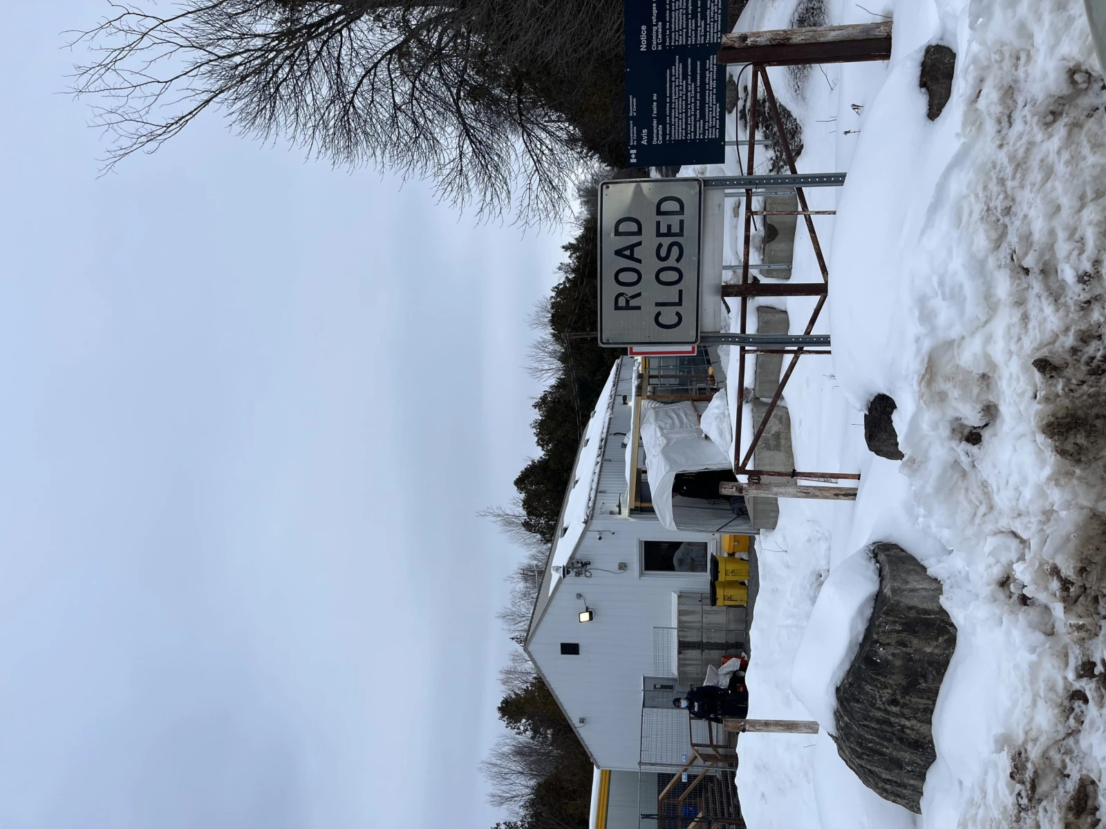 Après une trentaine de minutes, nous voici enfin au bout du cul-de-sac où des agents frontaliers canadiens attendent un énième convoi de personnes cherchant refuge. Franchement, je m’attendais à quelque chose de plus impressionnant comme set-up après ce trop-plein d’attention médiatique. Sans la van avec deux journalistes de CNN attendant l’arrivée des migrants et la présence d’agents de la GRC, on se croirait dans à peu près n’importe quel chemin de rang près de Valcourt. Les quelques pancartes et deux bâtiments blancs de type conteneurs à proximité évoquent plus un chantier de construction banal qu’un centre de décontamination digne de la série Tchernobyl, un peu comme je me l’imaginais au départ.