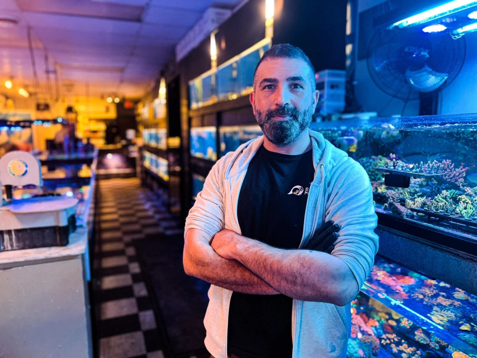 Raja Abboud, fondateur et propriétaire de la boutique, a eu la gentillesse de m’initier au monde de l’aquariophilie. Il me raconte que plusieurs client.e.s attrapent la piqûre en s’émerveillant du spectacle illuminé offert par le grand réservoir central. Chez certain.e.s adeptes, la passion naît à la suite d’un voyage de plongée et ils et elles veulent recréer une partie de l’océan dans leur salon.