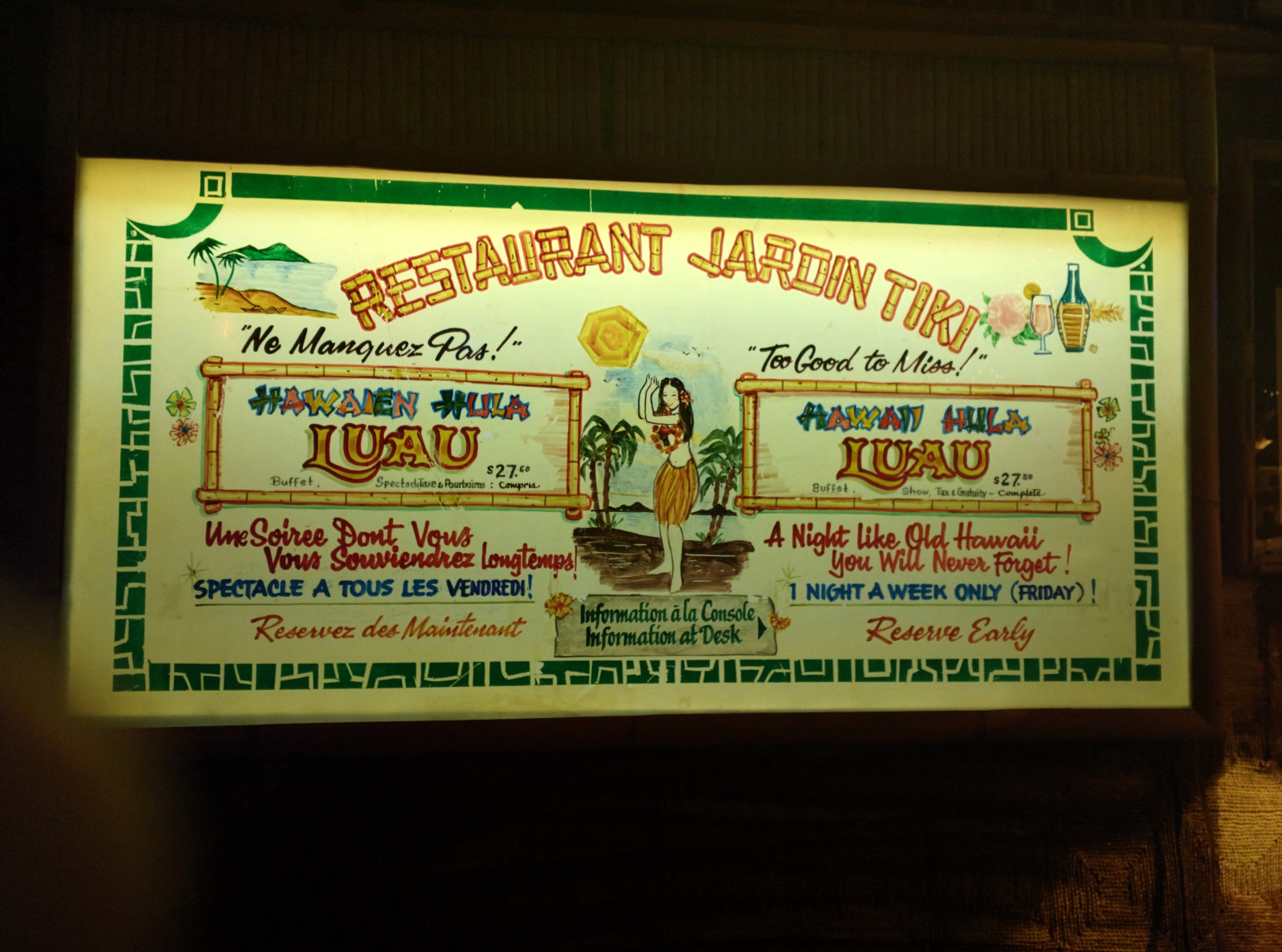 Après vingt-neuf ans de loyaux services à la population montréalaise en mal de décor kitscho-polynésien ou de buffet chinois-américain où egg rolls dubitatifs côtoient onion rings d’une croustillance expirée et filets de saumon pâlottes, le Jardin Tiki fermera officiellement ses portes dimanche.