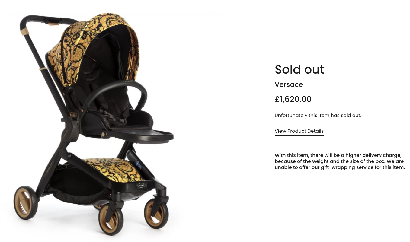 Plusieurs paramètres détermineront le prix de la poussette: les matériaux utilisés, le nombre de sièges et leurs options d’arrangements, les fonctions supplémentaires (un porte-gobelet?), et les terrains qu’elle pourra affronter. Sachez toutefois que les prix oscillent entre 200$ et un peu plus de 1000$, selon les modèles et les fonctions, avec d’autres pouvant coûter pas mal plus cher, comme ce carrosse Versace :