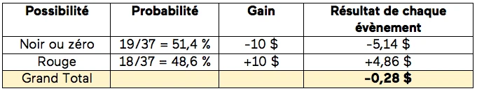 Prenons le jeu de la roulette française qui n’a qu’un zéro. On peut miser sur le rouge qui nous donnerait 10 $ si la bille s’arrête sur un chiffre rouge et un autre résultat qui nous ferait perdre notre 10 $.