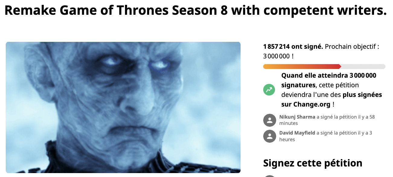 Et gare aux scénaristes qui mettront le bonheur des fans en péril. Car si cela arrive, la situation peut tourner en guerre virtuelle et ouverte entre les fans et les créateurs ou créatrices de la série. Lors de la finale de Game of Thrones en 2019, par exemple, une pétition exigeant qu’une fin alternative avec des « scénaristes compétents » soit filmée réunira pas moins de 1,8 million de signatures. En 2022, des internautes la signent encore.