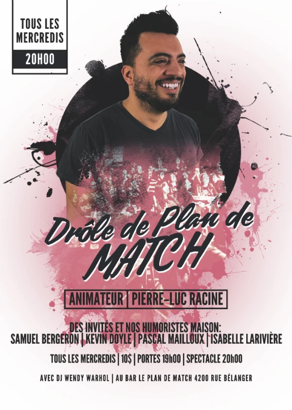 D’ailleurs, j’animerai les soirées Drôle De Plan De Match au bar Le Plan de Match au 4200 rue Bélanger à Montréal tous les mercredis à 20h. Un petit 10$ qui va fera travailler vos zygomatiques! Venez me dire bonjour!