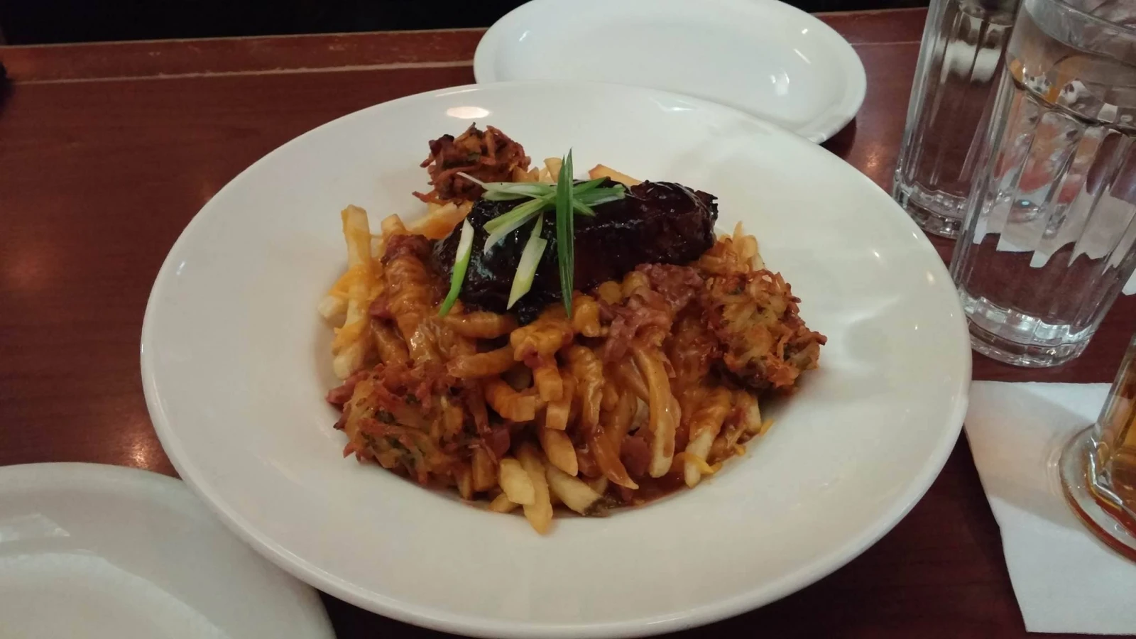 Pourtant, s’il y a un endroit où cette poutine a perdu quelques points, c’est au niveau de la consistance. Je m’explique: le choix du chef de privilégier un cheddar râpé (probablement en raison du fait qu’il était fumé) implique que, dans la durée, le cheddar se fusionne avec la sauce, ayant pour effet d’imbiber indûment les juliennes. En somme, on a privilégié la saveur aux dépens de la texture. On aurait sûrement pu mitiger les dommages en favorisant une cuisson supplémentaire des juliennes…