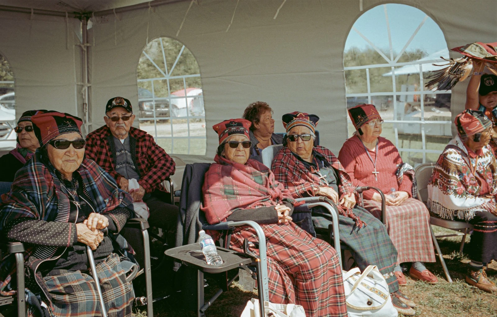 Pour l’occasion, le cercle sacré n’est réservé qu’aux danseurs adultes, les plus âgés se tenant aux extrémités, tandis que les femmes portant des clochettes se trouvent plus près du centre. Au cœur du cercle, une trentaine de convives de toutes les origines sont assis sur des chaises. Ce sont ceux visés par les traitements.