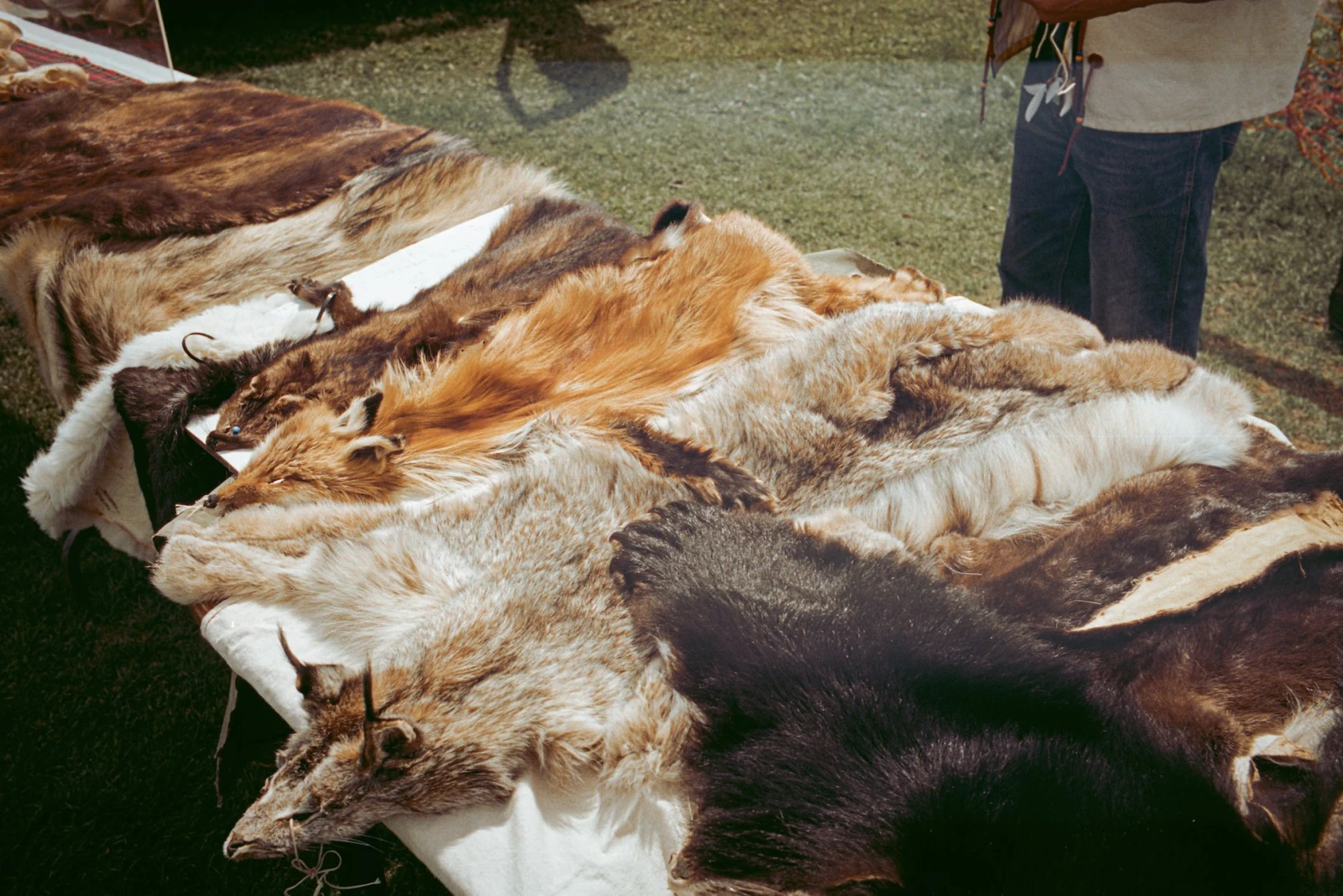 Philippe installe son kiosque de fourrures issues de la trappe. Martre, pékan, lynx, loup et bien d’autres sont en vente. « Du loup, il en reste en masse, mais du carcajou, y’en a pu beaucoup », indique-t-il en aspergeant sa casquette des Blackhawks d’anti-moustique.