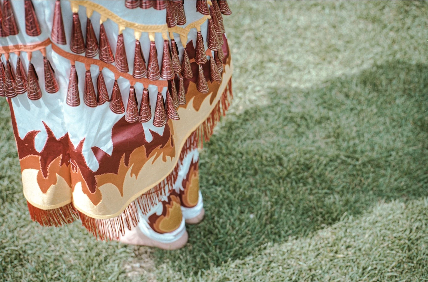 À l’intérieur du cercle sacré, les danseurs avancent en pas pointés, effectuant des chorégraphies gracieuses, chaussés de mocassins et parés de plumes. Plusieurs participantes sont drapées de clochettes, tandis que les hommes arborent des grelots aux chevilles.