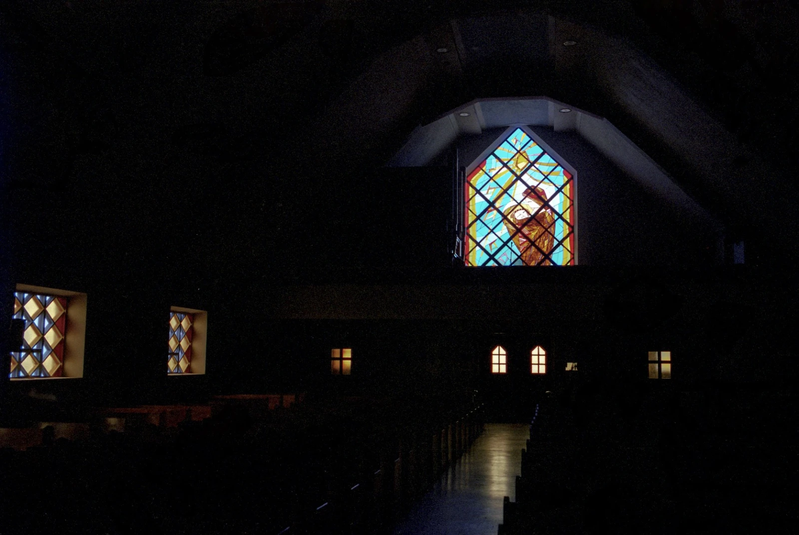 Une fois terminée, je m’y glisse avec Germain qui me fait remarquer les bibles traduites en innu-aimun et les symboles traditionnels dans les vitraux.