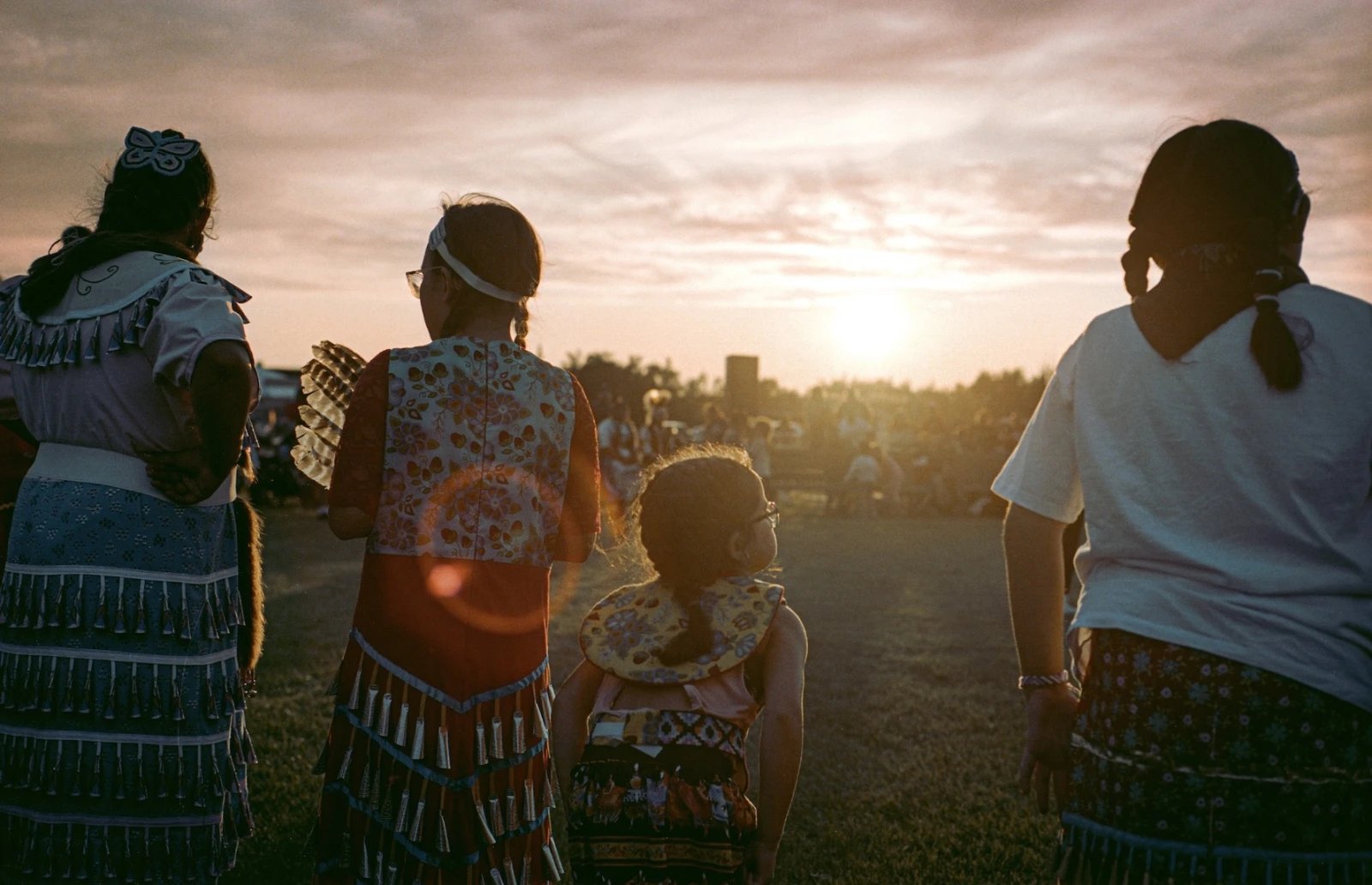 Le soleil couchant brille de tout son feu sur les ornementations, faisant valser les reflets comme les vagues du fleuve. Lorsque les tambours s’arrêtent, nous n’entendons plus que les tintements des vêtements, douce musique du pow-wow.