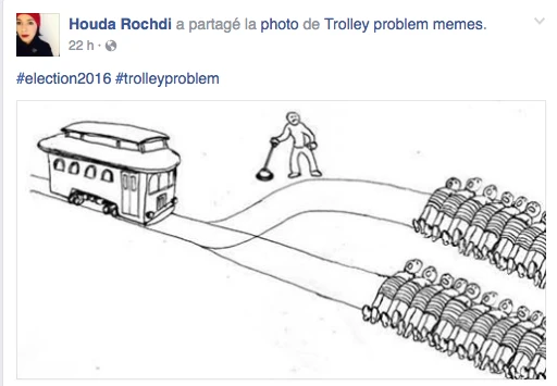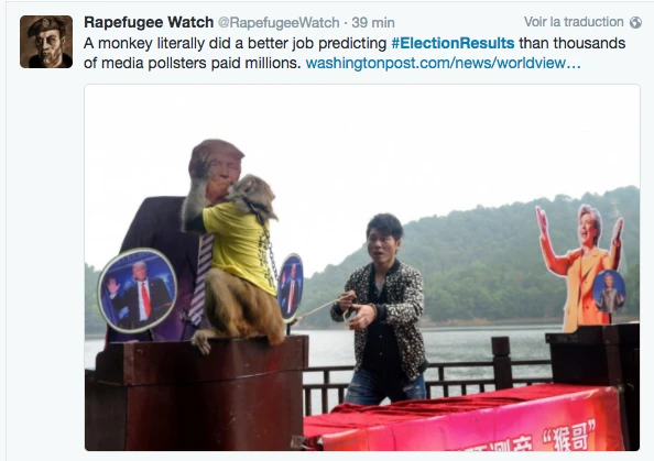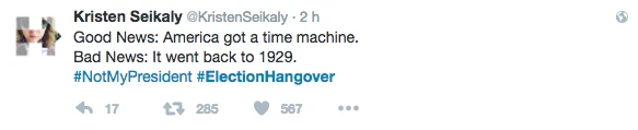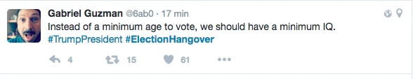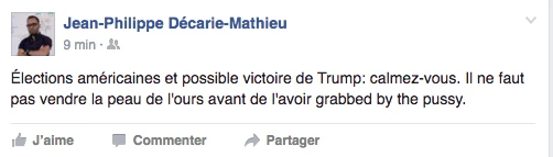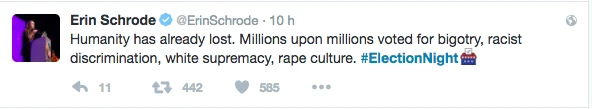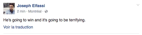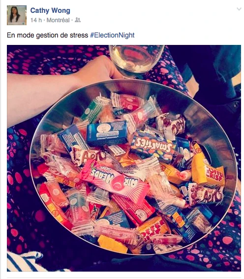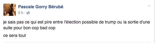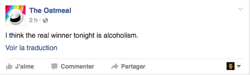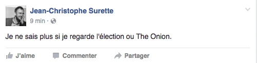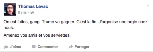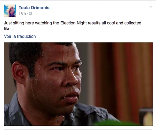 Hier, la soirée présidentielle était le prétexte parfait pour se commander une tite bouffe, s’ouvrir une tite bouteille de vino, prétendre être curieux Bégin avec l’insouciance heureuse mêlée à la certitude tranquille qu’on élirait la première présidente américaine ever. LOL. C’était davantage une descente dans les enfers brûlants, c’était la prophétie apocalyptique du gars-un-peu-fou-avec-une-pancarte du métro qui se réalisait, sous nos yeux, en direct. Le chaos en 144 caractères, la panique à coups d’émoticônes et de memes. On pouvait mesurer le pouls des médias sociaux: ça tweettait, ça s’époumonait le clavier, ça haletait comme un cœur qui bat la chamade, on sentait la fébrilité à travers les posts comiquo-ironiquo-alarmistes sur Facebook/Twitter.