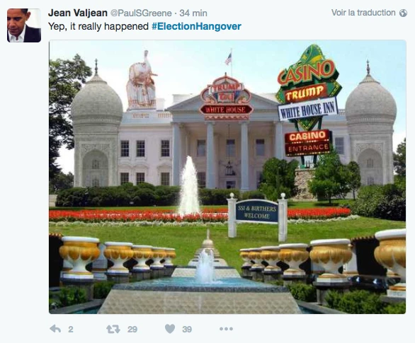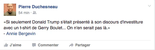 Et puis, ce matin, on se réveille tous avec l’impression d’avoir abusé du vin rouge et blanc cheap du dépanneur de la veille. Voici les commentaires tous azimuts que nous avons recueillis depuis le jour 1 de l’an Trump:
