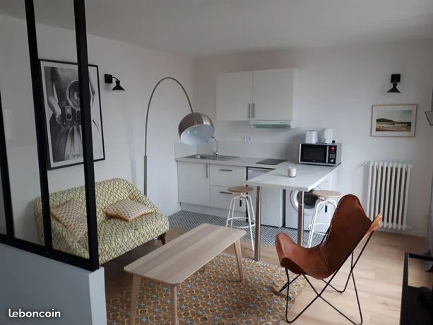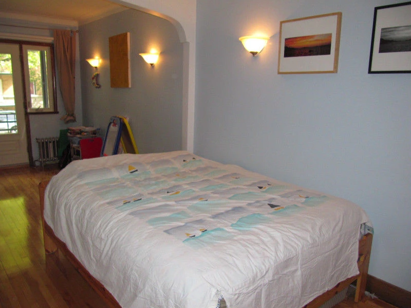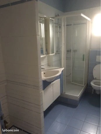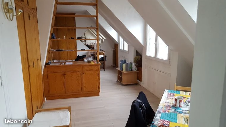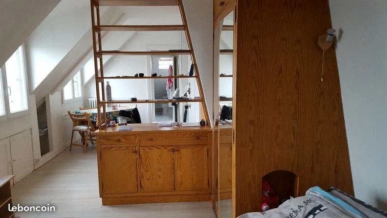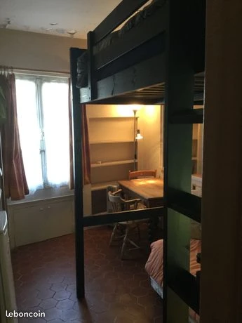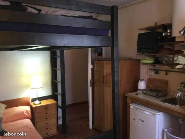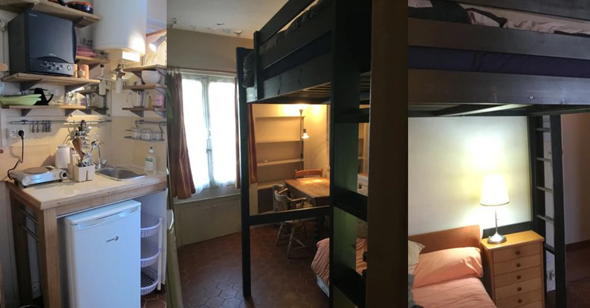 Ça peut avoir l’air charmant deux minutes. Mais remarquez que cette studette — pour « petit studio » — ne comprend pas de toilettes (elles sont sur l’étage), que la porte d’entrée est bloquée par le meuble de rangement et que quand vous sortez de la douche, vous êtes carrément en plein milieu de votre salle à manger. L’annonce précise que l’appartement est pour une seule personne, mais on doute qu’un couple (ou une amitié) puisse survivre à ça de toute façon…