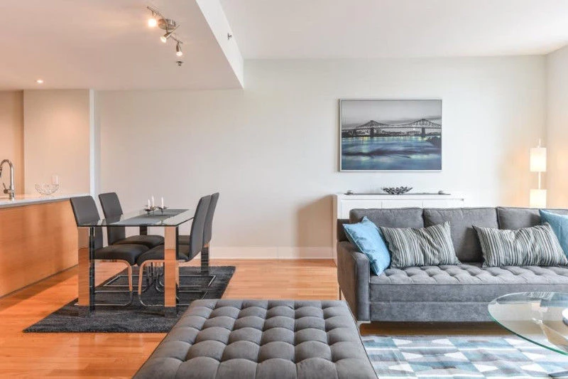 Budget de 2000 $ à Montréal? Évidemment à ce prix-là, on retrouve encore de beaux logements familiaux, mais on pourrait aussi choisir un appartement meublé dans le Vieux-Port avec une chambre, des comptoirs en marbre, un stationnement intérieur, un espace d’entreposage, l’accès à une piscine, un sauna et un gym, et le câble, comme celui-ci.
