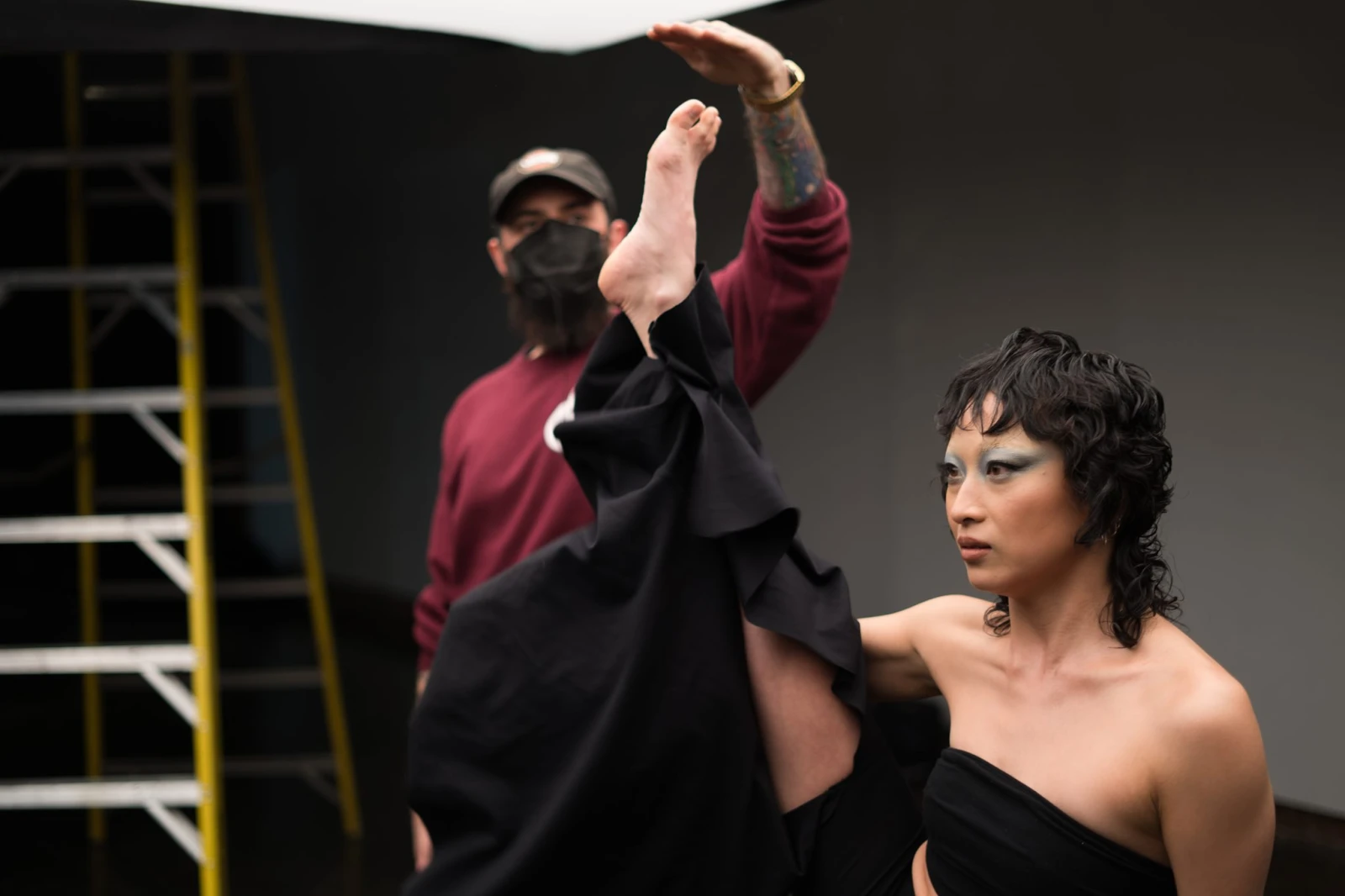 «Hey salut! Si tu veux un café ou une collation, sers-toi!», me lance gentiment Nicolas Lesage, qui travaille comme grip et gaffer sur le plateau. «Le projet est vraiment conçu pour être filmé. On ne veut pas simplement capter une chorégraphie, ou faire un simple clip. On souhaite vraiment que les danseur.euse.s jouent avec la cam, et que ça crée un tout harmonieux entre la danse, la musique, la lumière et l’image», m’explique-t-il, avant de retourner préparer son équipement.