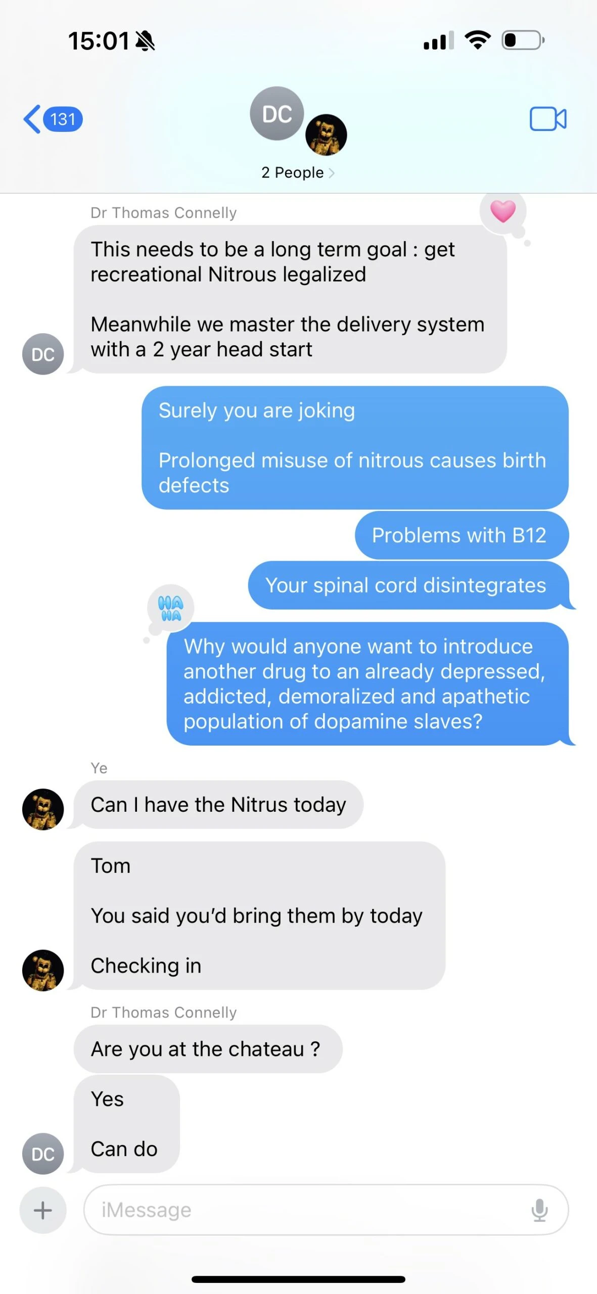 « Ce doit être un objectif à long terme : légaliser le protoxyde [à usage] récréatif », y aurait écrit ledit dentiste, Ye réclamant un peu plus bas une autre dose de gaz hilarant.