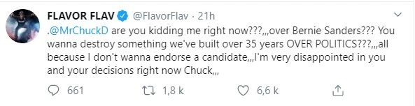 Il semble que Chuck D ait décidé tout seul que le groupe appuierait Sanders, parce que lorsque l’annonce de ce concert-rassemblement a été rendue publique, Flavor Flav, aussi connu pour avoir participé à la téléréalité The Farm, a fait parvenir une mise en demeure à Bernie Sanders lui ordonnant de cesser d’utiliser l’image de Public Enemy.
