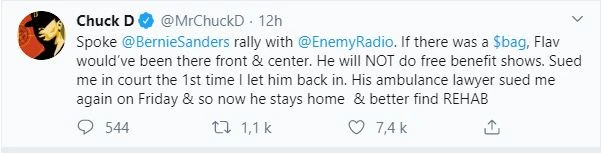 Dans tous les cas, il semble que Public Enemy continuera d’appuyer publiquement Bernie Sanders, mais sans son hypeman.