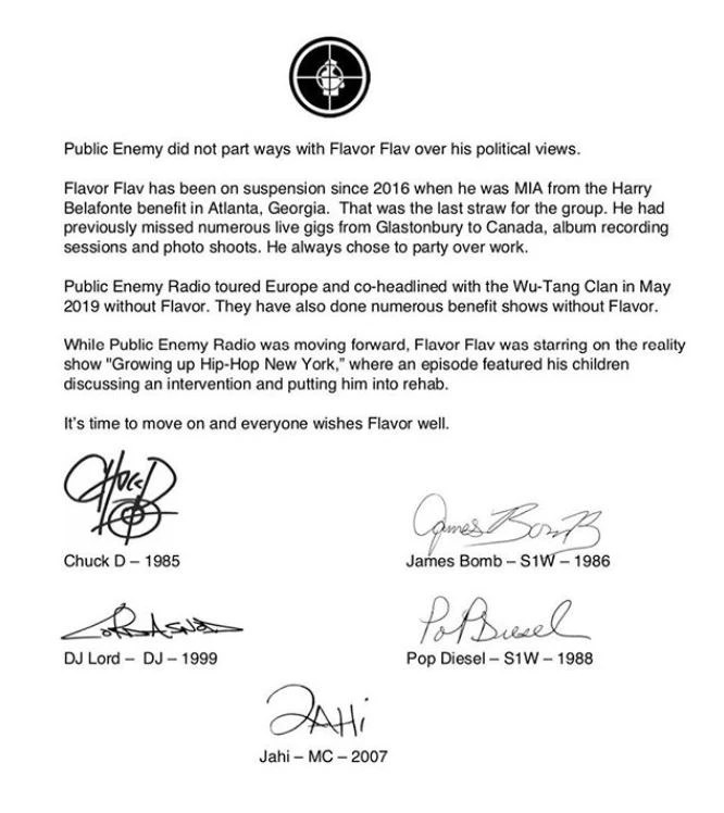 Dans un communiqué de presse, les membres restants expliquent que le renvoi de Flavor Flav ne résulte pas de ses opinions politiques. En fait, il serait suspendu de la formation depuis 2016, alors qu’il aurait refusé de participer à un concert-bénéfice pour Harry Belafonte.