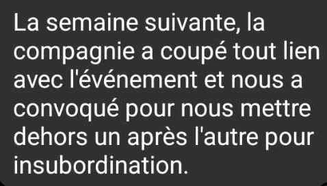 Une semaine plus tard, son patron le vire pour insubordination à l’issue du contrat qui s’est pourtant déroulé sans embûches. Peu de temps après, il apprend le licenciement de ses deux autres autres collègues, pour le même motif, et comprend que son patron cherchait à étouffer l’affaire.