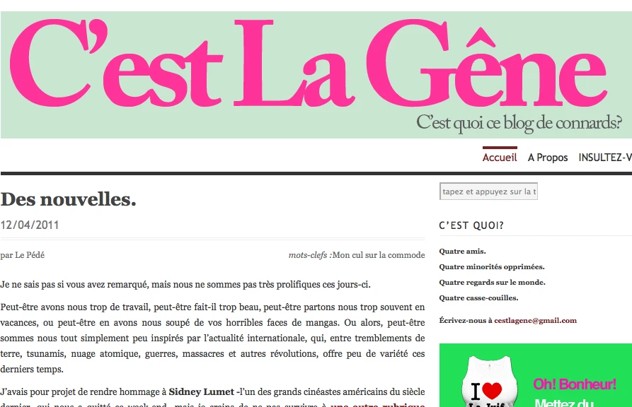 Le blogue français C’est la gêne se décrit comme un blogue «de connards»tenu par «4 amis, 4 minorités opprimées, 4 regards, 4 casses-couilles»,soit l’Arabe, la Meuf*, le Juif et le Pédé. C’est pas nous qui les appelons comme ça, c’est eux. Rencontre avec ces quatre «connards» aux pseudonymes poétiques et à la plume anti langue de bois.