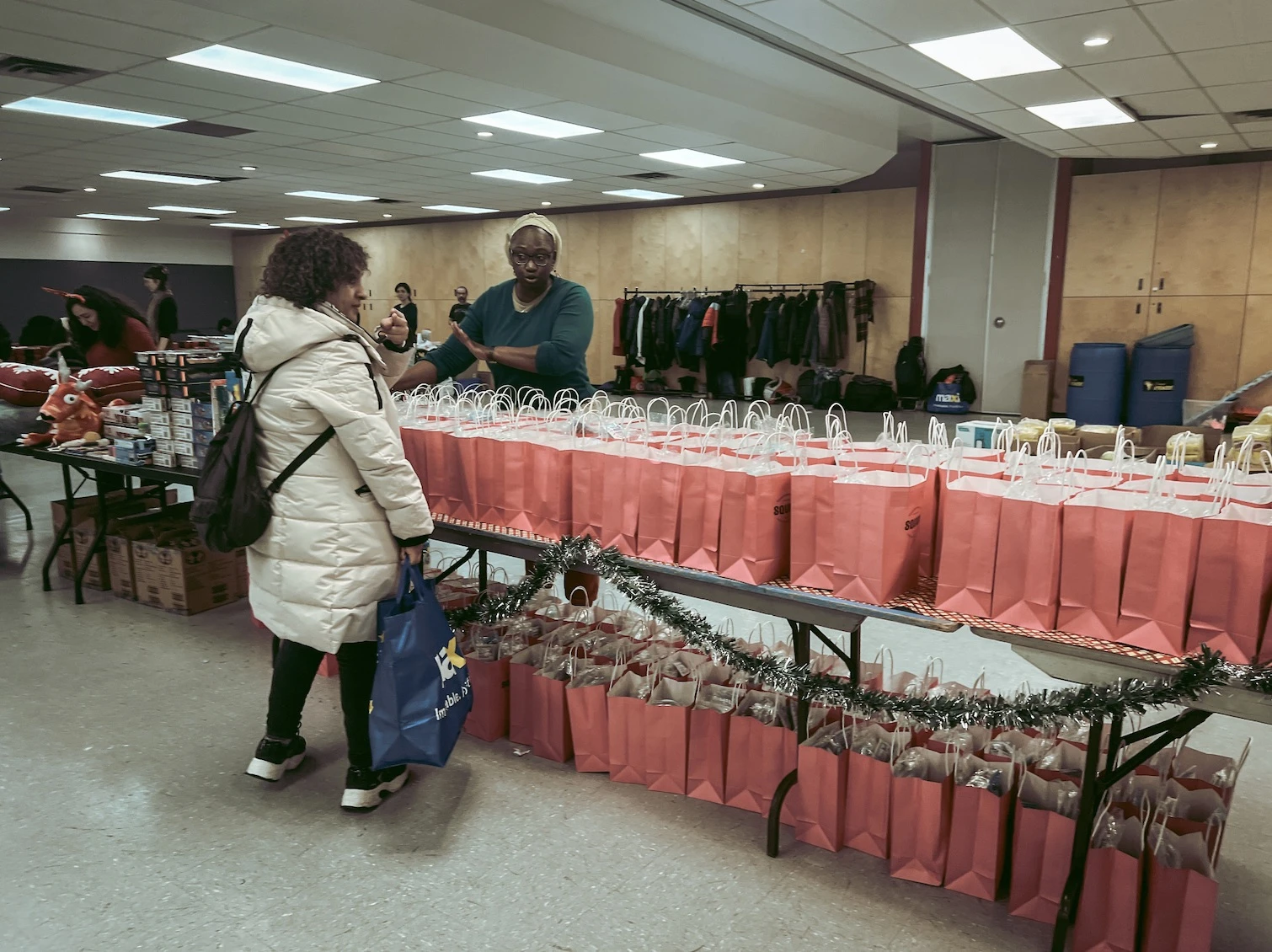 Derrière nous, débute une distribution alimentaire dans le cadre du souper de Noël annuel. On y propose à des prix abordables des denrées telles que de la cassonade, du pain, des carottes et du chou. De plus, des repas chauds sont prévus pour les familles, des morceaux de gâteau et, même, un bar à boissons gazeuses. Des sacs cadeaux sont également préparés pour les femmes.