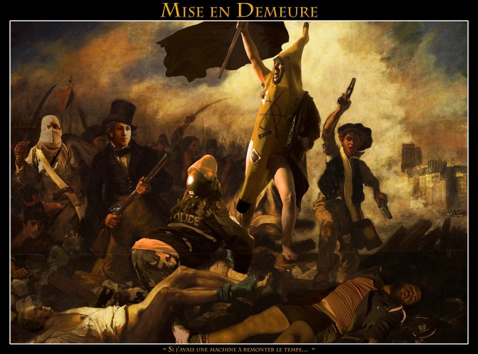 Pendant qu’on y est, le pire reproche qu’on pourrait faire à Mise En Demeure, c’est d’avoir modifié La Liberté guidant le peuple alors que Coldplay l’a déjà fait il y a quatre ans pour la pochette de son album Viva La Vida. Avoir une idée APRÈS Coldplay, faut l’faire!