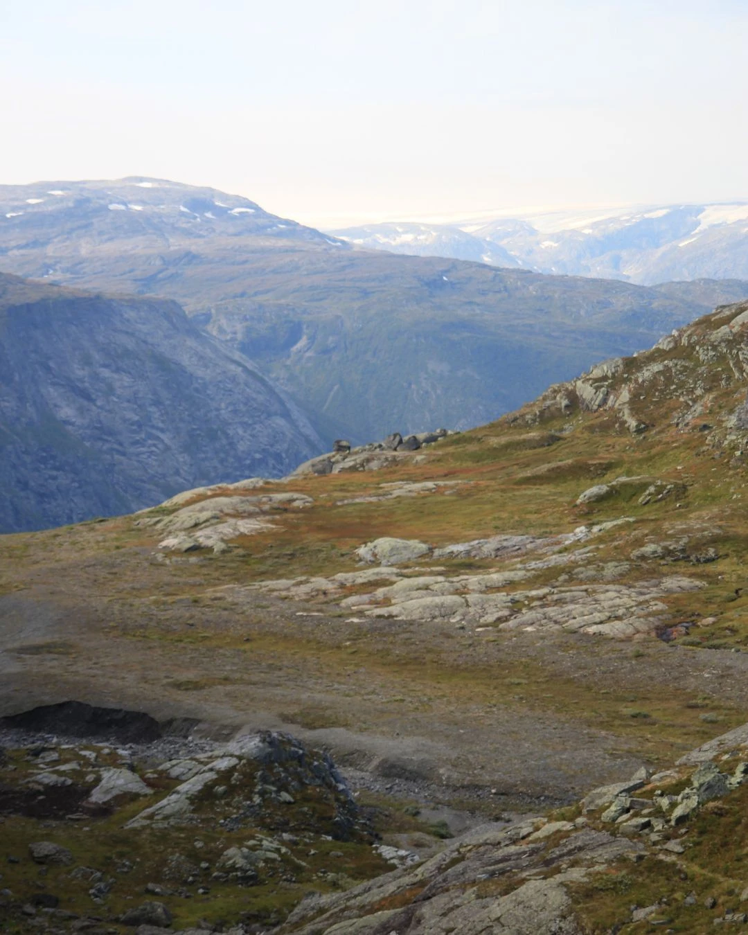 Rendu au P3, le fun commence. On est sur un plateau montagneux aride, un paysage complètement différent des fjords verdoyants où on était quelques heures auparavant : c’est l’entrée dans le plateau d’Hardangervidda, au-dessus de la limite des arbres. Au loin, le glacier Folgefonna apparaît dans son immensité.