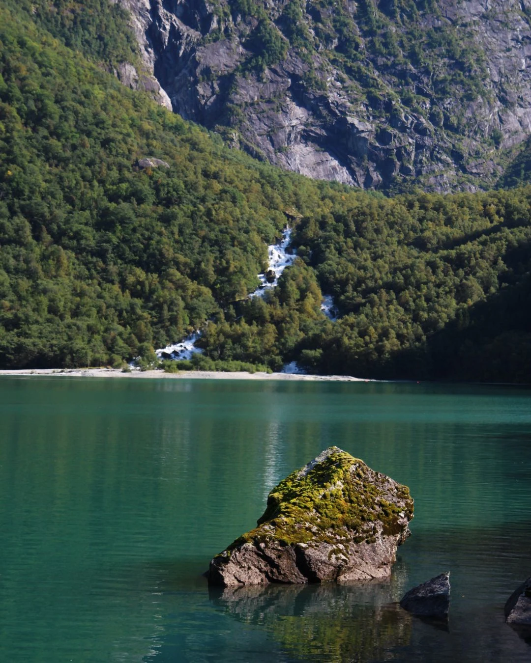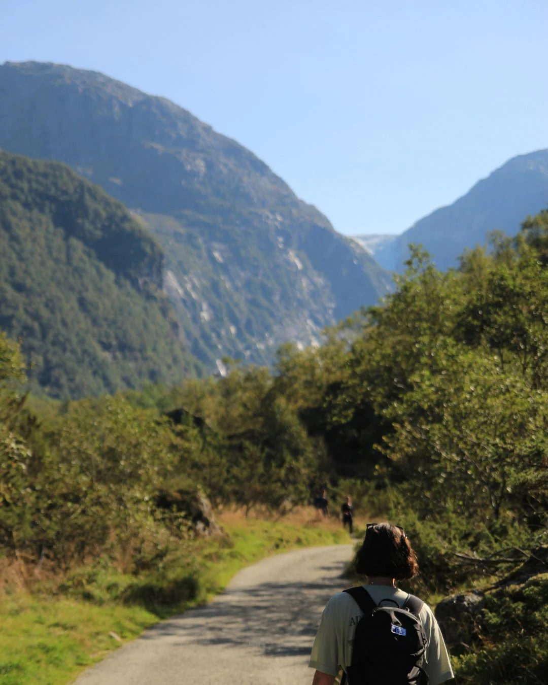 On arrive ensuite au lac lui-même, avec, au loin, le glacier qui semble reposer un de ses membres entre les montagnes. Celles et ceux qui ne sont pas rassasiés peuvent prendre le sentier qui fait le tour du lac pour aller voir de plus près le glacier et les puissantes chutes d’eau qui en découlent. Il y a aussi des sentiers qui mènent plus haut, pour se rapprocher encore plus, mais ceux-ci sont réservés aux plus expérimenté.e.s (quoiqu’en Norvège, personne ne vous empêche jamais de faire ce que vous voulez dans la nature; soyez juste prudent.e.s, ok?).