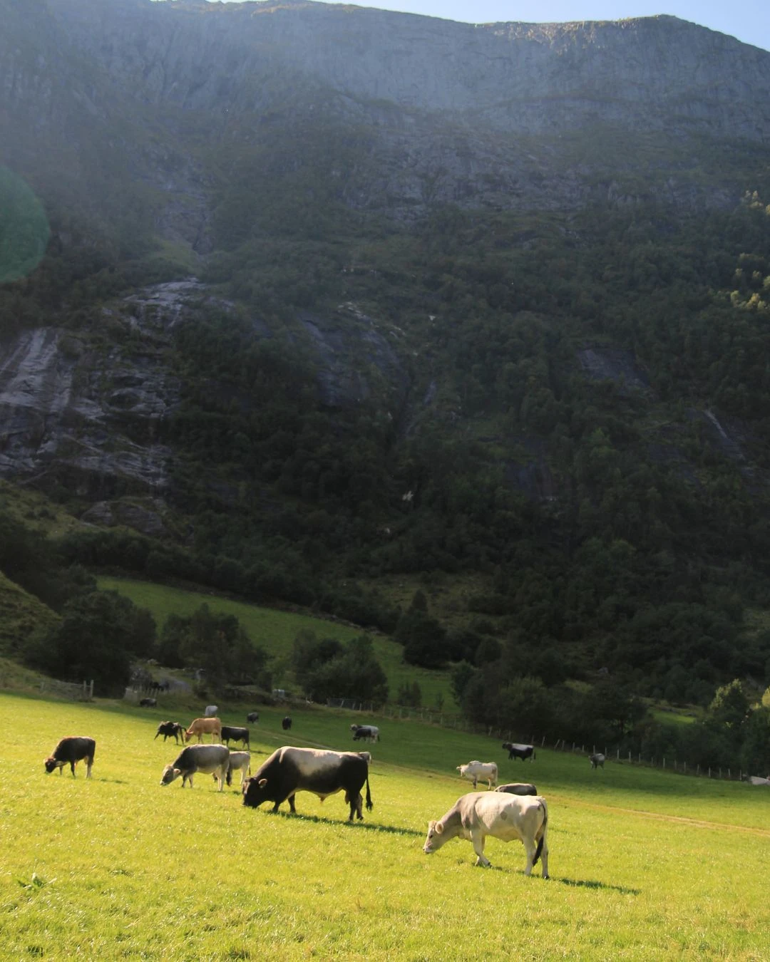 Les premiers 2,5 km de la randonnée sont en légère ascension. À gauche, la rivière qui prend sa source dans le lac Bondhus (qui prend lui-même son eau de la fonte du glacier) déferle à toute vitesse. À droite, après des grands champs peuplés de sympathiques vaches, la paroi de la falaise se rapproche tranquillement.