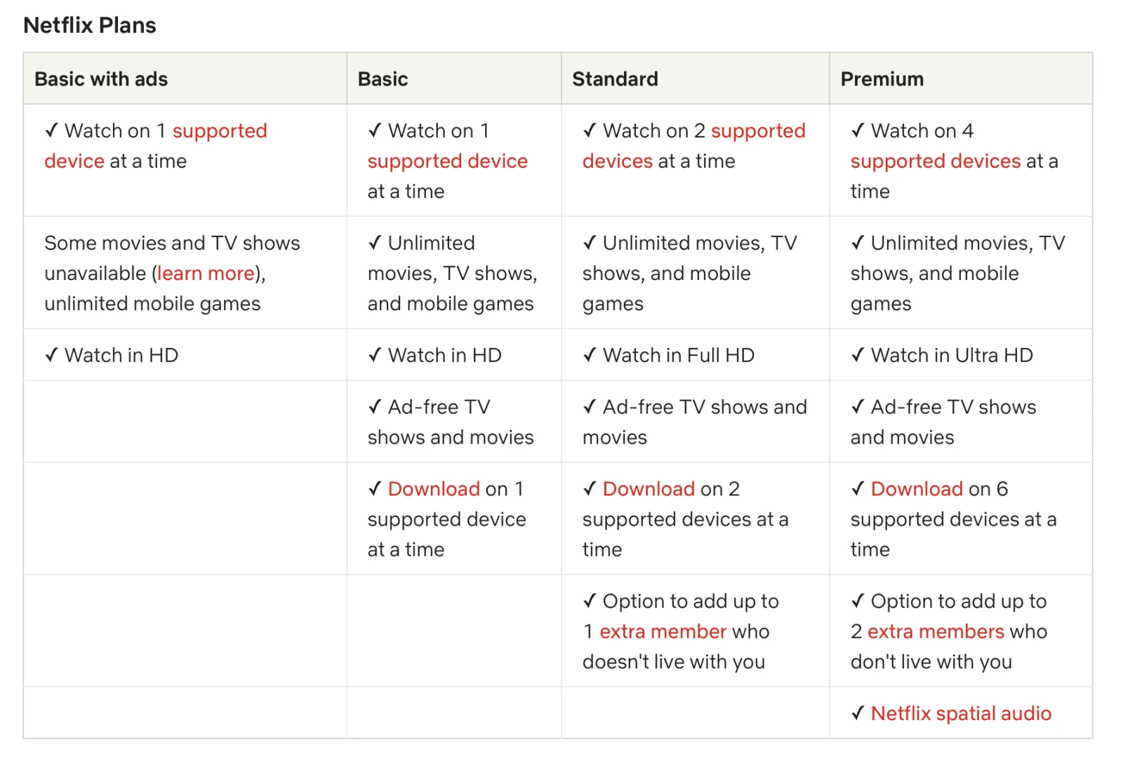 Le forfait standard, qui permet de visionner en qualité HD et qui offre l’option de partager sa connexion avec une personne (pour un coût supplémentaire) coûte 16,49 $ par mois. Il existe finalement un forfait premium à 20,99 $ qui permet de regarder Netflix en 4K et partager sa connexion avec deux personnes hors de son foyer (en payant un supplément).
